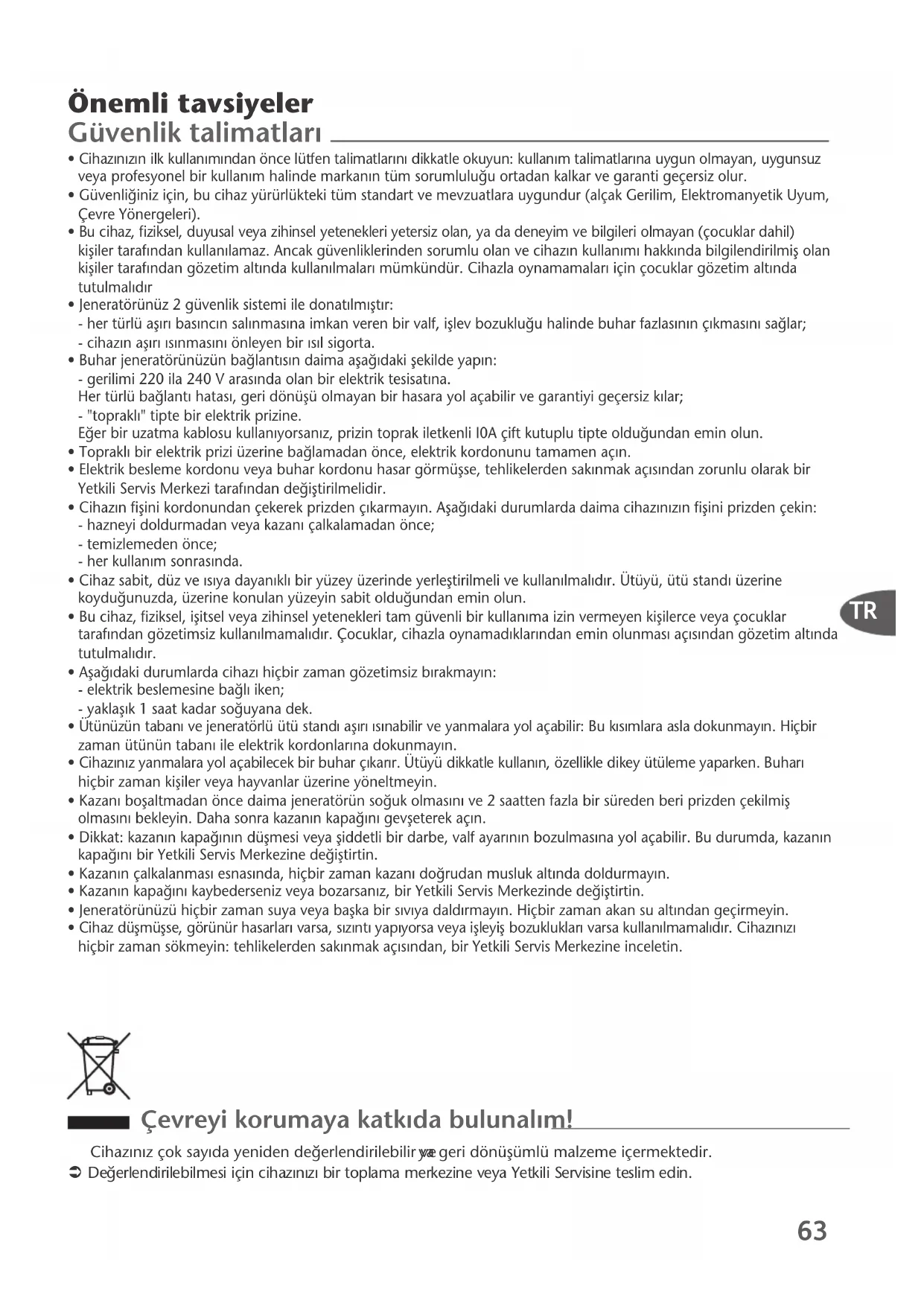 • Cihaz›n›z›n ilk kullan›m›ndan önce lütfen talimatlar›n› dikkatle okuyun: kullan›m talimatlar›na uygun olmayan, uygunsuz veya profesyonel bir kullan›m halinde markan›n tüm sorumlulu¤u ortadan kalkar ve garanti geçersiz olur.• Güvenli¤iniz için, bu cihaz yürürlükteki tüm standart ve mevzuatlara uygundur (alçak Gerilim, Elektromanyetik Uyum,Çevre Yönergeleri). • Bu cihaz, fiziksel, duyusal veya zihinsel yetenekleri yetersiz olan, ya da deneyim ve bilgileri olmayan (çocuklar dahil) kifliler taraf›ndan kullan›lamaz. Ancak güvenliklerinden sorumlu olan ve cihaz›n kullan›m› hakk›nda bilgilendirilmifl olankifliler taraf›ndan gözetim alt›nda kullan›lmalar› mümkündür. Cihazla oynamamalar› için çocuklar gözetim alt›ndatutulmal›d›r• Jeneratörünüz 2 güvenlik sistemi ile donat›lm›flt›r:- her türlü afl›r› bas›nc›n sal›nmas›na imkan veren bir valf, ifllev bozuklu¤u halinde buhar fazlas›n›n ç›kmas›n› sa¤lar;- cihaz›n afl›r› ›s›nmas›n› önleyen bir ›s›l sigorta.• Buhar jeneratörünüzün ba¤lant›s›n daima afla¤›daki flekilde yap›n:- gerilimi 220 ila 240 V aras›nda olan bir elektrik tesisat›na.Her türlü ba¤lant› hatas›, geri dönüflü olmayan bir hasara yol açabilir ve garantiyi geçersiz k›lar;- "toprakl›" tipte bir elektrik prizine.E¤er bir uzatma kablosu kullan›yorsan›z, prizin toprak iletkenli I0A çift kutuplu tipte oldu¤undan emin olun.• Toprakl› bir elektrik prizi üzerine ba¤lamadan önce, elektrik kordonunu tamamen aç›n.• Elektrik besleme kordonu veya buhar kordonu hasar görmüflse, tehlikelerden sak›nmak aç›s›ndan zorunlu olarak birYetkili Servis Merkezi taraf›ndan de¤ifltirilmelidir.• Cihaz›n fiflini kordonundan çekerek prizden ç›karmay›n. Afla¤›daki durumlarda daima cihaz›n›z›n fiflini prizden çekin:- hazneyi doldurmadan veya kazan› çalkalamadan önce;- temizlemeden önce;- her kullan›m sonras›nda.• Cihaz sabit, düz ve ›s›ya dayan›kl› bir yüzey üzerinde yerlefltirilmeli ve kullan›lmal›d›r. Ütüyü, ütü stand› üzerinekoydu¤unuzda, üzerine konulan yüzeyin sabit oldu¤undan emin olun.• Bu cihaz, fiziksel, iflitsel veya zihinsel yetenekleri tam güvenli bir kullan›ma izin vermeyen kiflilerce veya çocuklartaraf›ndan gözetimsiz kullan›lmamal›d›r. Çocuklar, cihazla oynamad›klar›ndan emin olunmas› aç›s›ndan gözetim alt›ndatutulmal›d›r.• Afla¤›daki durumlarda cihaz› hiçbir zaman gözetimsiz b›rakmay›n:- elektrik beslemesine ba¤l› iken;- yaklafl›k 1 saat kadar so¤uyana dek. • Ütünüzün taban› ve jeneratörlü ütü stand› afl›r› ›s›nabilir ve yanmalara yol açabilir: Bu k›s›mlara asla dokunmay›n. Hiçbir zaman ütünün taban› ile elektrik kordonlar›na dokunmay›n. • Cihaz›n›z yanmalara yol açabilecek bir buhar ç›kar›r. Ütüyü dikkatle kullan›n, özellikle dikey ütüleme yaparken. Buhar› hiçbir zaman kifliler veya hayvanlar üzerine yöneltmeyin.• Kazan› boflaltmadan önce daima jeneratörün so¤uk olmas›n› ve 2 saatten fazla bir süreden beri prizden çekilmiflolmas›n› bekleyin. Daha sonra kazan›n kapa¤›n› gevfleterek aç›n.• Dikkat: kazan›n kapa¤›n›n düflmesi veya fliddetli bir darbe, valf ayar›n›n bozulmas›na yol açabilir. Bu durumda, kazan›nkapa¤›n› bir Yetkili Servis Merkezine de¤ifltirtin.• Kazan›n çalkalanmas› esnas›nda, hiçbir zaman kazan› do¤rudan musluk alt›nda doldurmay›n.• Kazan›n kapa¤›n› kaybederseniz veya bozarsan›z, bir Yetkili Servis Merkezinde de¤ifltirtin.• Jeneratörünüzü hiçbir zaman suya veya baflka bir s›v›ya dald›rmay›n. Hiçbir zaman akan su alt›ndan geçirmeyin. • Cihaz düflmüflse, görünür hasarlar› varsa, s›z›nt› yap›yorsa veya iflleyifl bozukluklar› varsa kullan›lmamal›d›r. Cihaz›n›z› hiçbir zaman sökmeyin: tehlikelerden sak›nmak aç›s›ndan, bir Yetkili Servis Merkezine inceletin. Çevreyi korumaya katk›da bulunal›m!
