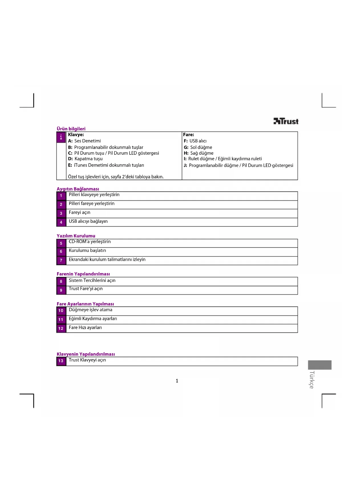 Ürün bilgileri Klavye: A: Ses Denetimi B: Programlanabilir dokunmalı tuşlar C: Pil Durum tuşu / Pil Durum LED göstergesi D: Kapatma tuşu E: iTunes Demetimi dokunmalı tuşları Özel tuş işlevleri için, sayfa 2’deki tabloya bakın. Fare: F: USB alıcı G: Sol düğme H: Sağ düğme I: Rulet düğme / Eğimli kaydırma ruleti J: Programlanabilir düğme / Pil Durum LED göstergesi Aygıtın Bağlanması Pilleri klavyeye yerleştirin Pilleri fareye yerleştirin Fareyi açın USB alıcıyı bağlayın Yazılım Kurulumu CD-ROM’a yerleştirin Kurulumu başlatın Ekrandaki kurulum talimatlarını izleyin Farenin Yapılandırılması Sistem Tercihlerini açın Trust Fare’yi açın Fare Ayarlarının Yapılması Düğmeye işlev atama Eğimli Kaydırma ayarları Fare Hızı ayarları