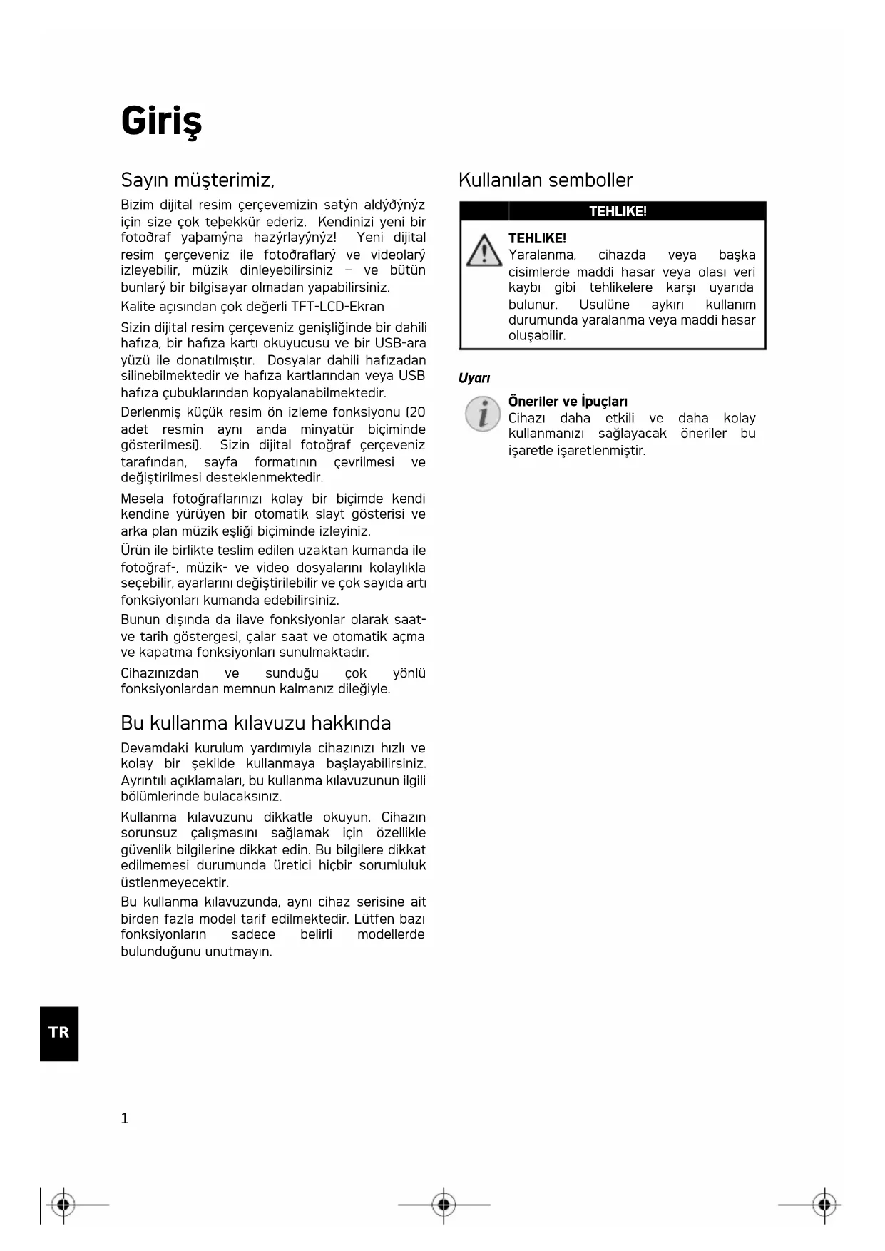 Giriş Sayın müşterimiz, Bizim dijital resim çerçevemizin satýn aldýðýnýz için size çok teþekkür ederiz. Kendinizi yeni bir fotoðraf yaþamýna hazýrlayýnýz! Yeni dijital resim çerçeveniz ile fotoðraflarý ve videolarý izleyebilir, müzik dinleyebilirsiniz – ve bütün bunlarý bir bilgisayar olmadan yapabilirsiniz. Kalite açısından çok değerli TFT-LCD-Ekran Belleği Sizin dijital resim çerçeveniz genişliğinde bir dahili hafıza, bir hafıza kartı okuyucusu ve bir USB-ara yüzü ile donatılmıştır. Dosyalar dahili hafızadan silinebilmektedir ve hafıza kartlarından veya USB hafıza çubuklarından kopyalanabilmektedir. Derlenmiş küçük resim ön izleme fonksiyonu (20 adet resmin aynı anda minyatür biçiminde gösterilmesi). Sizin dijital fotoğraf çerçeveniz tarafından, sayfa formatının çevrilmesi ve değiştirilmesi desteklenmektedir. Mesela fotoğraflarınızı kolay bir biçimde kendi kendine yürüyen bir otomatik slayt gösterisi ve arka plan müzik eşliği biçiminde izleyiniz. Ürün ile birlikte teslim edilen uzaktan kumanda ile fotoğraf-, müzik- ve video dosyalarını kolaylıkla seçebilir, ayarlarını değiştirilebilir ve çok sayıda artı fonksiyonları kumanda edebilirsiniz. Bunun dışında da ilave fonksiyonlar olarak saat- ve tarih göstergesi, çalar saat ve otomatik açma ve kapatma fonksiyonları sunulmaktadır. Cihazınızdan ve sunduğu çok yönlü fonksiyonlardan memnun kalmanız dileğiyle. Bu kullanma kılavuzu hakkında Devamdaki kurulum yardımıyla cihazınızı hızlı ve kolay bir şekilde kullanmaya başlayabilirsiniz. Ayrıntılı açıklamaları, bu kullanma kılavuzunun ilgili bölümlerinde bulacaksınız. Kullanma kılavuzunu dikkatle okuyun. Cihazın sorunsuz çalışmasını sağlamak için özellikle güvenlik bilgilerine dikkat edin. Bu bilgilere dikkat edilmemesi durumunda üretici hiçbir sorumluluk üstlenmeyecektir. Bu kullanma kılavuzunda, aynı cihaz serisine ait birden fazla model tarif edilmektedir. Lütfen bazı fonksiyonların sadece belirli modellerde bulunduğunu unutmayın. Kullanılan semboller Tehlike Uyarısı Öneriler ve İpuçlar ı TEHLIKE! TEHLIKE! Yaralanma, cihazda veya başka cisimlerde maddi hasar veya olası veri kaybı gibi tehlikelere karşı uyarıda bulunur. Usulüne aykırı kullanım durumunda yaralanma veya maddi hasar oluşabilir. Uyarı Öneriler ve İpuçları Cihazı daha etkili ve daha kolay kullanmanızı sağlayacak öneriler bu işaretle işaretlenmiştir. af-5077_5087_5107psms_manual_14_tr_253243477-a.book Seite 1 Donnerstag, 2. Juli 2009 12:05 122