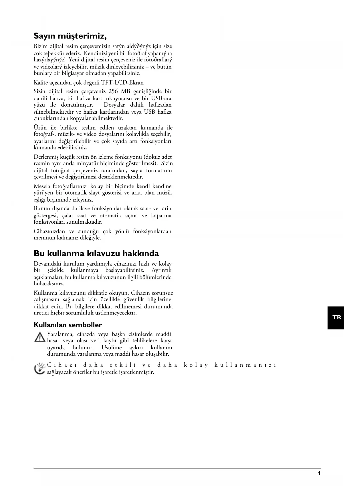 Sayın müşterimiz, Bizim dijital resim çerçevemizin satýn aldýðýnýz için size çok teþekkür ederiz. Kendinizi yeni bir fotoðraf yaþamýna hazýrlayýnýz! Yeni dijital resim çerçeveniz ile fotoðraflarý ve videolarý izleyebilir, müzik dinleyebilirsiniz – ve bütün bunlarý bir bilgisayar olmadan yapabilirsiniz. Kalite açısından çok değerli TFT-LCD-Ekran Belleği Sizin dijital resim çerçeveniz 256 MB genişliğinde bir dahili hafıza, bir hafıza kartı okuyucusu ve bir USB-ara yüzü ile donatılmıştır. Dosyalar dahili hafızadan silinebilmektedir ve hafıza kartlarından veya USB hafıza çubuklarından kopyalanabilmektedir. Ürün ile birlikte teslim edilen uzaktan kumanda ile fotoğraf-, müzik- ve video dosyalarını kolaylıkla seçebilir, ayarlarını değiştirilebilir ve çok sayıda artı fonksiyonları kumanda edebilirsiniz. Derlenmiş küçük resim ön izleme fonksiyonu (dokuz adet resmin aynı anda minyatür biçiminde gösterilmesi). Sizin dijital fotoğraf çerçeveniz tarafından, sayfa formatının çevrilmesi ve değiştirilmesi desteklenmektedir. Mesela fotoğraflarınızı kolay bir biçimde kendi kendine yürüyen bir otomatik slayt gösterisi ve arka plan müzik eşliği biçiminde izleyiniz. Bunun dışında da ilave fonksiyonlar olarak saat- ve tarih göstergesi, çalar saat ve otomatik açma ve kapatma fonksiyonları sunulmaktadır. Cihazınızdan ve sunduğu çok yönlü fonksiyonlardan memnun kalmanız dileğiyle. Bu kullanma kılavuzu hakkında Devamdaki kurulum yardımıyla cihazınızı hızlı ve kolay bir şekilde kullanmaya başlayabilirsiniz. Ayrıntılı açıklamaları, bu kullanma kılavuzunun ilgili bölümlerinde bulacaksınız. Kullanma kılavuzunu dikkatle okuyun. Cihazın sorunsuz çalışmasını sağlamak için özellikle güvenlik bilgilerine dikkat edin. Bu bilgilere dikkat edilmemesi durumunda üretici hiçbir sorumluluk üstlenmeyecektir. Kullanılan semboller Tehlike UyarısıNot açıklaması Yaralanma, cihazda veya başka cisimlerde maddi hasar veya olası veri kaybı gibi tehlikelere karşı uyarıda bulunur. Usulüne aykırı kullanım durumunda yaralanma veya maddi hasar oluşabilir. Cihazı daha etkili ve daha kolay kullanmanızı sağlayacak öneriler bu işaretle işaretlenmiştir. af-5105_5086_5135ms_manual_tr.book Seite 1 Montag, 15. September 2008 4:43 162 AgfaPhoto Digital Photo Frame AF 5086MS · AF 5105MS · AF5135MS