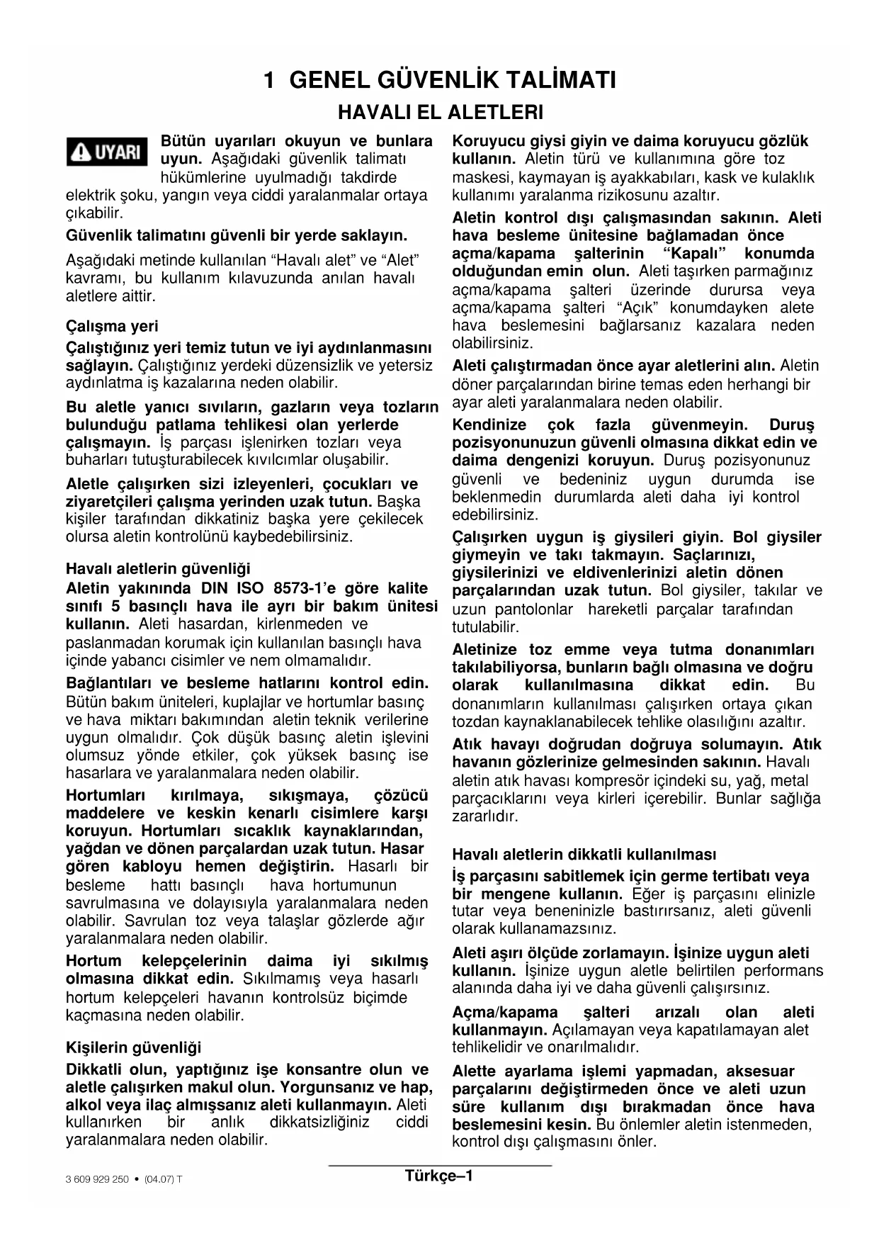 1 GENEL GÜVENL∑K TAL∑MATI HAVALI EL ALETLERI Bütün uyar∂lar∂ okuyun ve bunlara