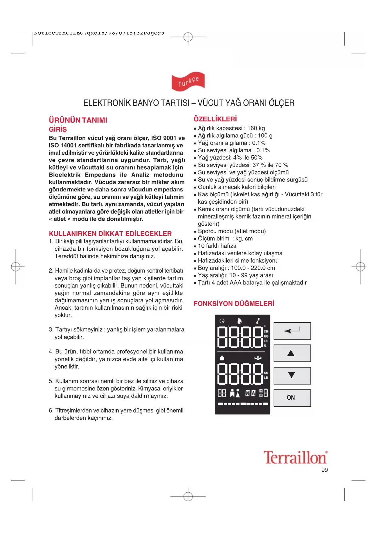 ÜRÜNÜN TANIMI GİRİŞBu Terraillon vücut yağ oran ölçer, ISO 9001 veISO 14001 sertifikal bir fabrikada tasarlanmş veimal edilmiştir ve yürürlükteki kalite standartlarnave çevre standartlarna uygundur. Tart, yağlkütleyi ve vücuttaki su orann hesaplamak içinBioelektrik Empedans ile Analiz metodunukullanmaktadr. Vücuda zararsz bir miktar akmgöndermekte ve daha sonra vücudun empedansölçümüne göre, su orann ve yağl kütleyi tahminetmektedir. Bu tart, ayn zamanda, vücut yaplaratlet olmayanlara göre değişik olan atletler için bir« atlet » modu ile de donatlmştr.KULLANIRKEN DİKKAT EDİLECEKLER1. Bir kalp pili taşyanlar tarty kullanmamaldrlar. Bu,cihazda bir fonksiyon bozukluğuna yol açabilir.Tereddüt halinde hekiminize danşnz.2. Hamile kadnlarda ve protez, doğum kontrol tertibatveya broş gibi implantlar taşyan kişilerde tartmsonuçlar yanlş çkabilir. Bunun nedeni, vücuttakiyağn normal zamandakine göre ayn eşitliktedağlmamasnn yanlş sonuçlara yol açmasdr.Ancak, tartnn kullanlmasnn sağlk için bir riskiyoktur.3. Tarty sökmeyiniz ; yanlş bir işlem yaralanmalarayol açabilir.4. Bu ürün, tbbi ortamda profesyonel bir kullanmayönelik değildir, yalnzca evde aile içi kullanma yöneliktir.5. Kullanm sonras nemli bir bez ile siliniz ve cihazasu girmemesine özen gösteriniz. Kimyasal eriyiklerkullanmaynz ve cihaz suya daldrmaynz.6. Titreşimlerden ve cihazn yere düşmesi gibi önemlidarbelerden kaçnnz.ÖZELLİKLERİ • Ağrlk kapasitesi : 160 kg • Ağrlk alglama gücü : 100 g • Yağ oran alglama : 0.1% • Su seviyesi alglama : 0.1% • Yağ yüzdesi: 4% ile 50% • Su seviyesi yüzdesi: 37 % ile 70 % • Su seviyesi ve yağ yüzdesi ölçümü • Su ve yağ yüzdesi sonuç bildirme sürgüsü • Günlük alnacak kalori bilgileri • Kas ölçümü (İskelet kas ağrlğ - Vücuttaki 3 türkas çeşidinden biri) • Kemik oran ölçümü (tart vücudunuzdakimineralleşmiş kemik faznn mineral içeriğinigösterir) • Sporcu modu (atlet modu) • Ölçüm birimi : kg, cm • 10 farkl hafza • Hafzadaki verilere kolay ulaşma • Hafzadakileri silme fonksiyonu • Boy aralğ : 100.0 - 220.0 cm • Yaş aralğ: 10 - 99 yaş aras • Tart 4 adet AAA batarya ile çalşmaktadrFONKSİYON DÜĞMELERİ