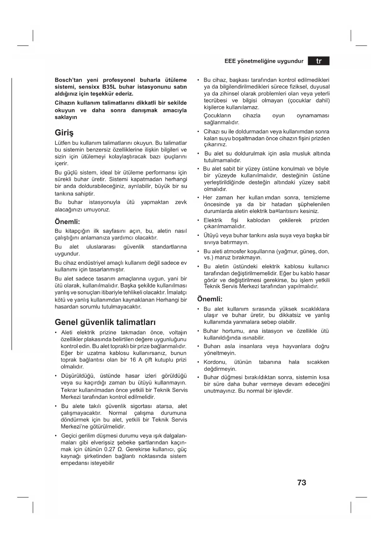 • Buhar hortumu, ana istasyon ve özellikle ütü