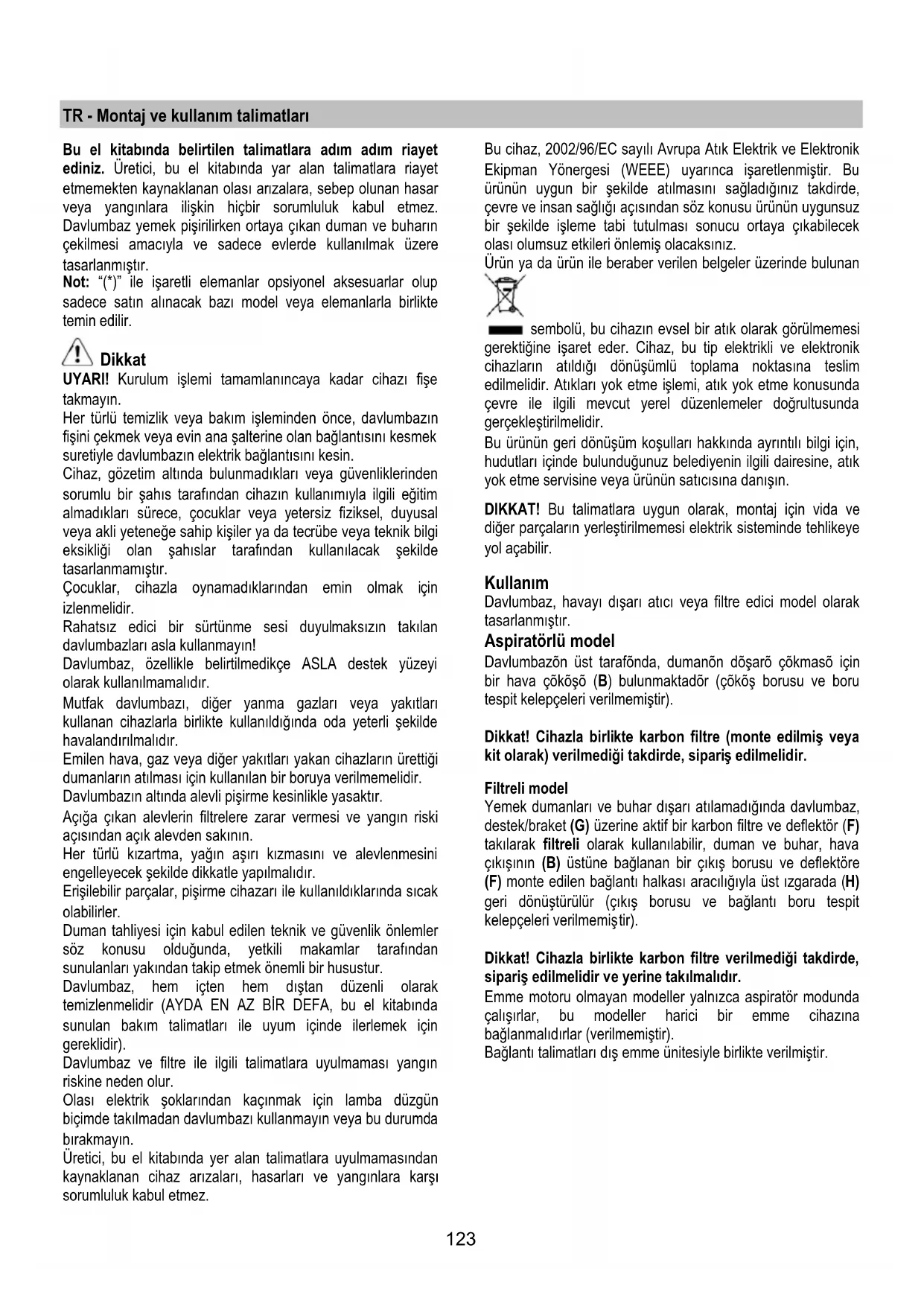 Uyarı: Davlumbaza ilişkin temel temizleme talimatlarının