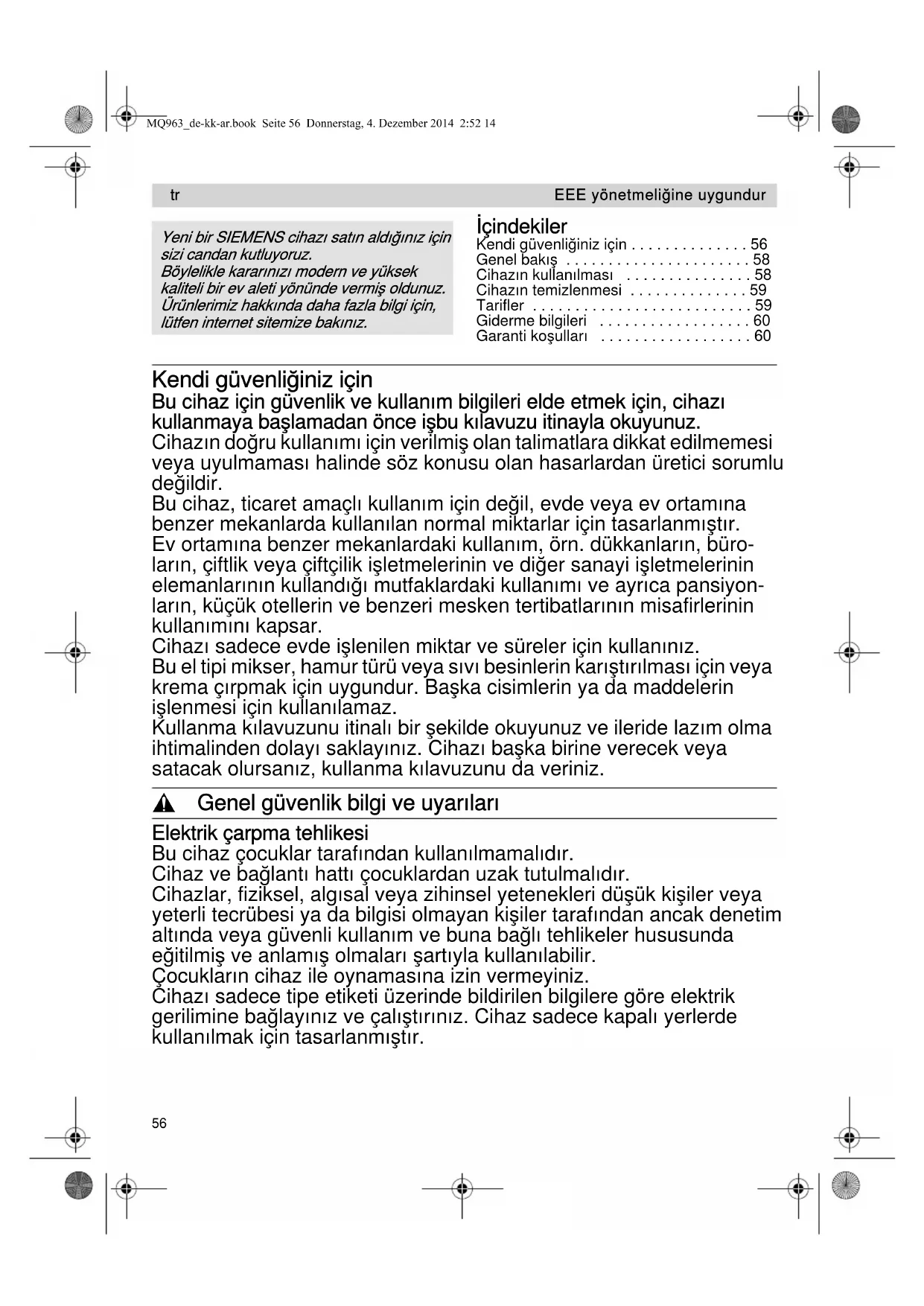 İçindekiler Kendi güvenliğiniz için . . . . . . . . . . . . . . 56Genel bakış . . . . . . . . . . . . . . . . . . . . . . 58Cihazın kullanılması . . . . . . . . . . . . . . . 58Cihazın temizlenmesi . . . . . . . . . . . . . . 59Tarifler . . . . . . . . . . . . . . . . . . . . . . . . . . 59Giderme bilgileri . . . . . . . . . . . . . . . . . . 60Garanti koşulları . . . . . . . . . . . . . . . . . . 60 Kendi güvenliğiniz için