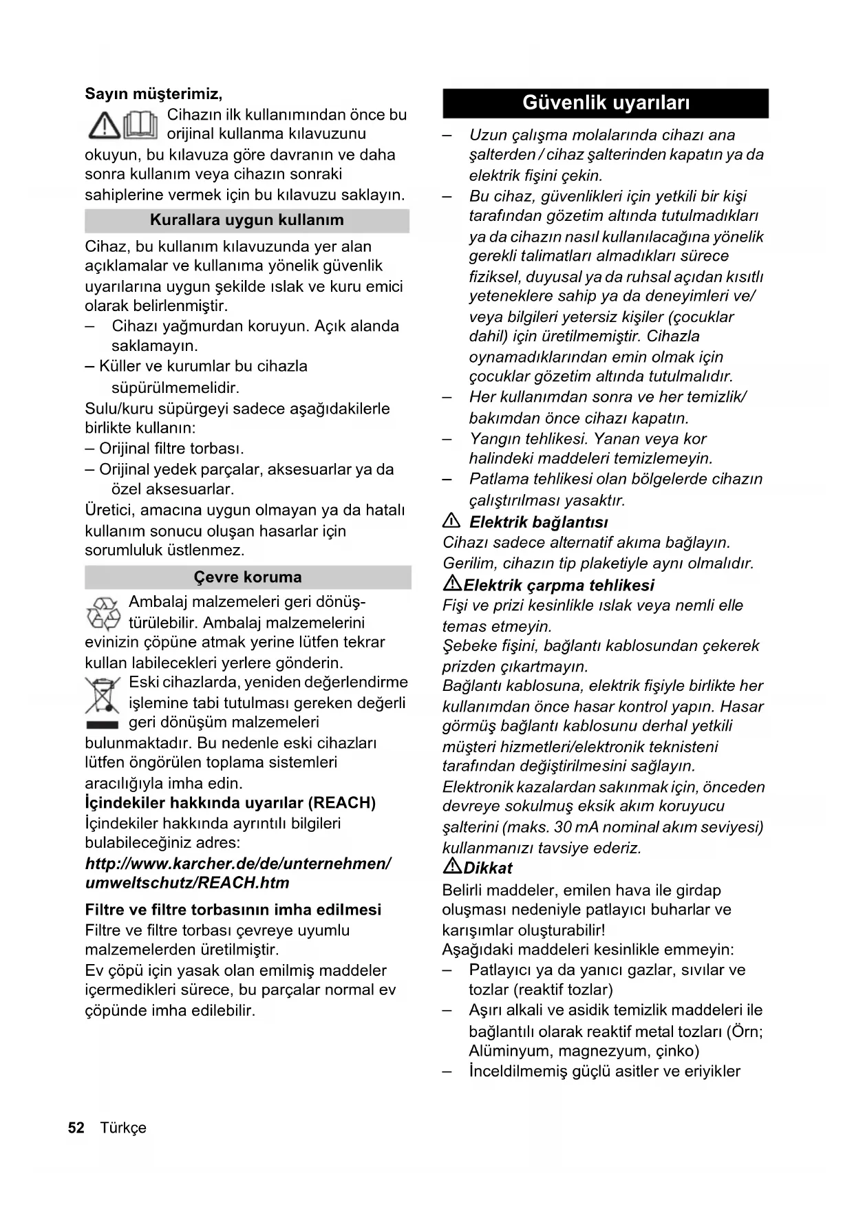 uyarılarına uygun şekilde ıslak ve kuru emici