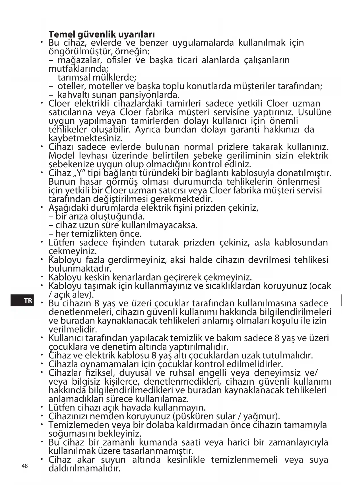 P48 Temel güvenlik uyarıları Bu cihaz, evlerde ve benzer uygulamalarda kullanılmak için öngörülmüştür, örneğin: – mağazalar, osler ve başka ticari alanlarda çalışanların mutfaklarında; – tarımsal mülklerde; – oteller, moteller ve başka toplu konutlarda müşteriler tarafından; – kahvaltı sunan pansiyonlarda. Cloer elektrikli cihazlardaki tamirleri sadece yetkili Cloer uzman satıcılarına veya Cloer fabrika müşteri servisine yaptırınız. Usulüne uygun yapılmayan tamirlerden dolayı kullanıcı için önemli tehlikeler oluşabilir. Ayrıca bundan dolayı garanti hakkınızı da kaybetmektesiniz. Cihazı sadece evlerde bulunan normal prizlere takarak kullanınız. Model levhası üzerinde belirtilen şebeke geriliminin sizin elektrik şebekenize uygun olup olmadığını kontrol ediniz. Cihaz „Y“ tipi bağlantı türündeki bir bağlantı kablosuyla donatılmıştır. Bunun hasar görmüş olması durumunda tehlikelerin önlenmesi için yetkili bir Cloer uzman satıcısı veya Cloer fabrika müşteri servisi tarafından değiştirilmesi gerekmektedir. Aşağıdaki durumlarda elektrik şini prizden çekiniz, – bir arıza oluştuğunda. – cihaz uzun süre kullanılmayacaksa. – her temizlikten önce. Lütfen sadece şinden tutarak prizden çekiniz, asla kablosundan çekmeyiniz. Kabloyu fazla gerdirmeyiniz, aksi halde cihazın devrilmesi tehlikesi bulunmaktadır. Kabloyu keskin kenarlardan geçirerek çekmeyiniz. Kabloyu taşımak için kullanmayınız ve sıcaklıklardan koruyunuz (ocak / açık alev). Bu cihazın 8 yaş ve üzeri çocuklar tarafından kullanılmasına sadece denetlenmeleri, cihazın güvenli kullanımı hakkında bilgilendirilmeleri ve buradan kaynaklanacak tehlikeleri anlamış olmaları koşulu ile izin verilmelidir. Kullanıcı tarafından yapılacak temizlik ve bakım sadece 8 yaş ve üzeri çocuklara ve denetim altında yaptırılmalıdır. Cihaz ve elektrik kablosu 8 yaş altı çocuklardan uzak tutulmalıdır. Cihazla oynamamaları için çocuklar kontrol edilmelidirler. Cihazlar ziksel, duyusal ve ruhsal engelli veya deneyimsiz ve/ veya bilgisiz kişilerce, denetlenmedikleri, cihazın güvenli kullanımı hakkında bilgilendirilmedikleri ve buradan kaynaklanacak tehlikeleri anlamadıkları sürece kullanılamaz. Lütfen cihazı açık havada kullanmayın. Cihazınızı nemden koruyunuz (püsküren sular / yağmur). Temizlemeden veya bir dolaba kaldırmadan önce cihazın tamamıyla soğumasını bekleyiniz. Bu cihaz bir zamanlı kumanda saati veya harici bir zamanlayıcıyla kullanılmak üzere tasarlanmamıştır. Cihaz akar suyun altında kesinlikle temizlenmemeli veya suya daldırılmamalıdır.