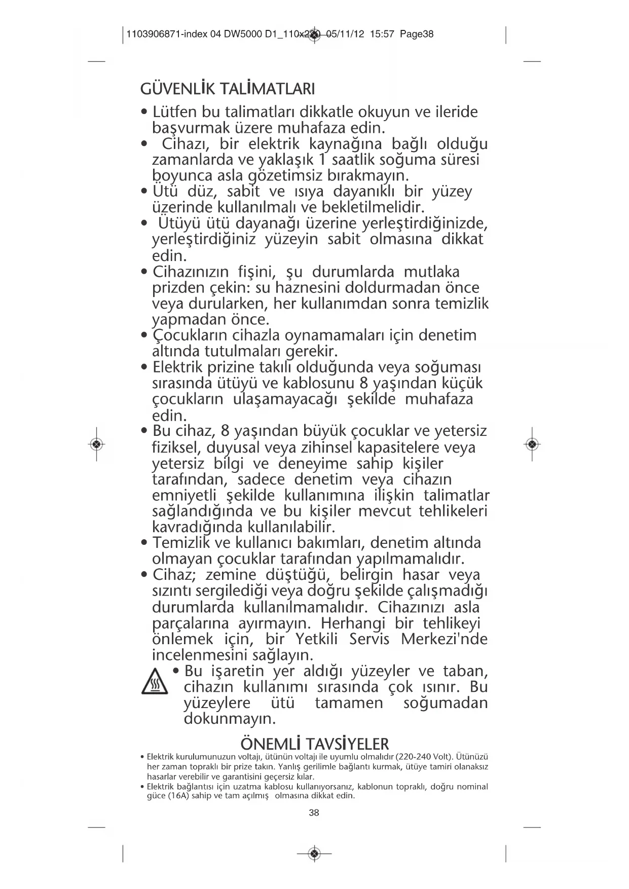 - Elektrik baWlantısı için uzatma kablosu kullanıyorsanız, kablonun topraklı, doWru nominal güce (16A) sahip ve tam açılmıY olmasına dikkat edin. 1103906871-index 04 DW5000 D1_110x220 05/11/12 15:57 Page3839