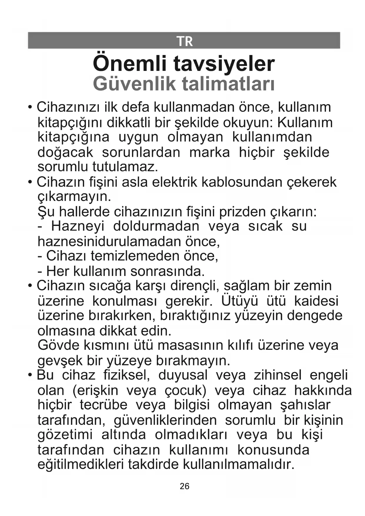• Cihazın fişini asla elektrik kablosundan çekerek