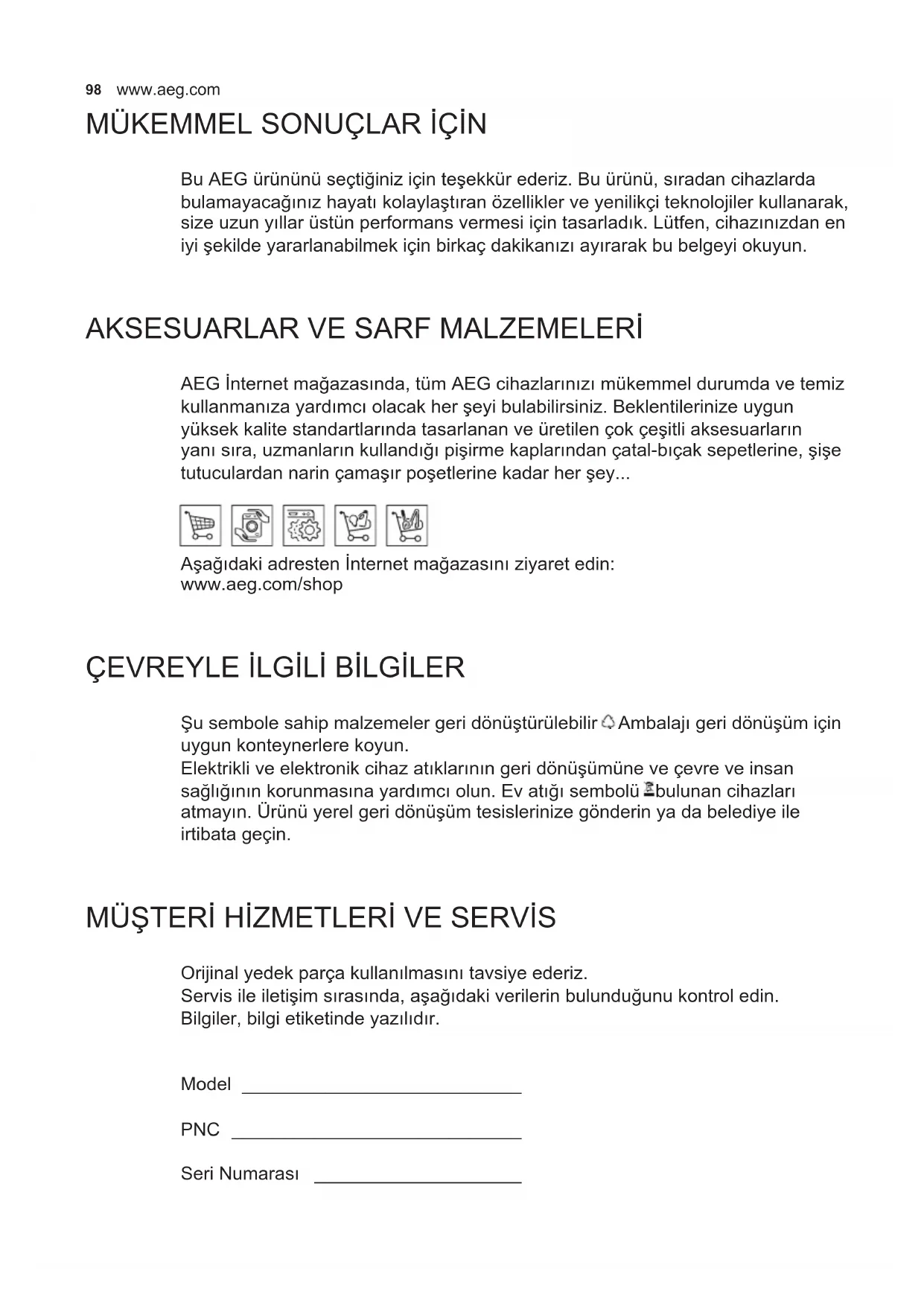 MÜKEMMEL SONUÇLAR İÇİN Bu AEG ürününü seçtiğiniz için teşekkür ederiz. Bu ürünü, sıradan cihazlarda