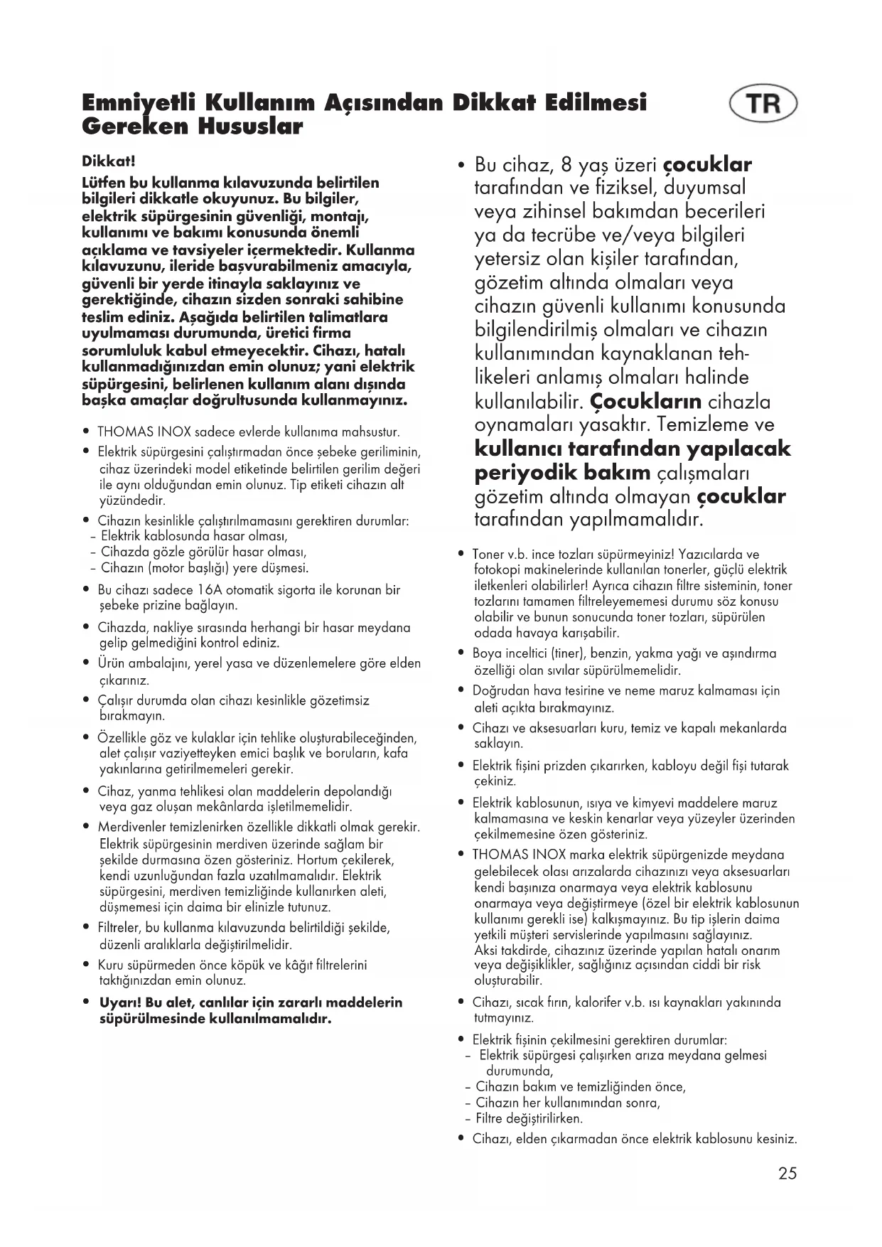 - THOMAS INOX marka elektrik süpürgenizde meydana gelebilecek olası arızalarda cihazınızı veya aksesuarları kendi başınıza onarmaya veya elektrik kablosunu onarmaya veya değiştirmeye (özel bir elektrik kablosunun kullanımı gerekli ise) kalkışmayınız. Bu tip işlerin daima yetkili müşteri servislerinde yapılmasını sağlayınız. Aksi takdirde, cihazınız üzerinde yapılan hatalı onarım veya değişiklikler, sağlığınız açısından ciddi bir risk oluşturabilir.