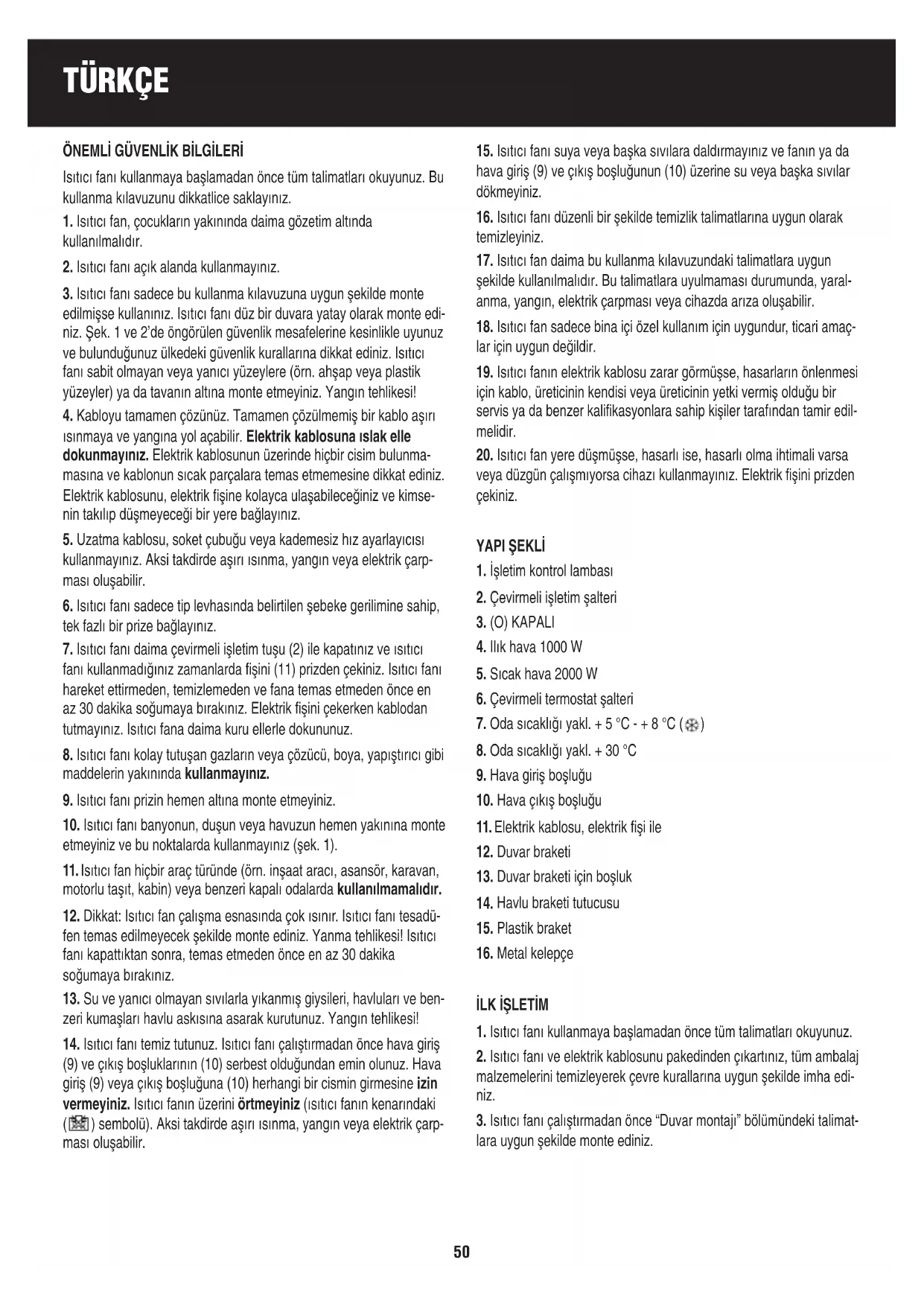17. Isıtıcı fan daima bu kullanma kılavuzundaki talimatlara uygun