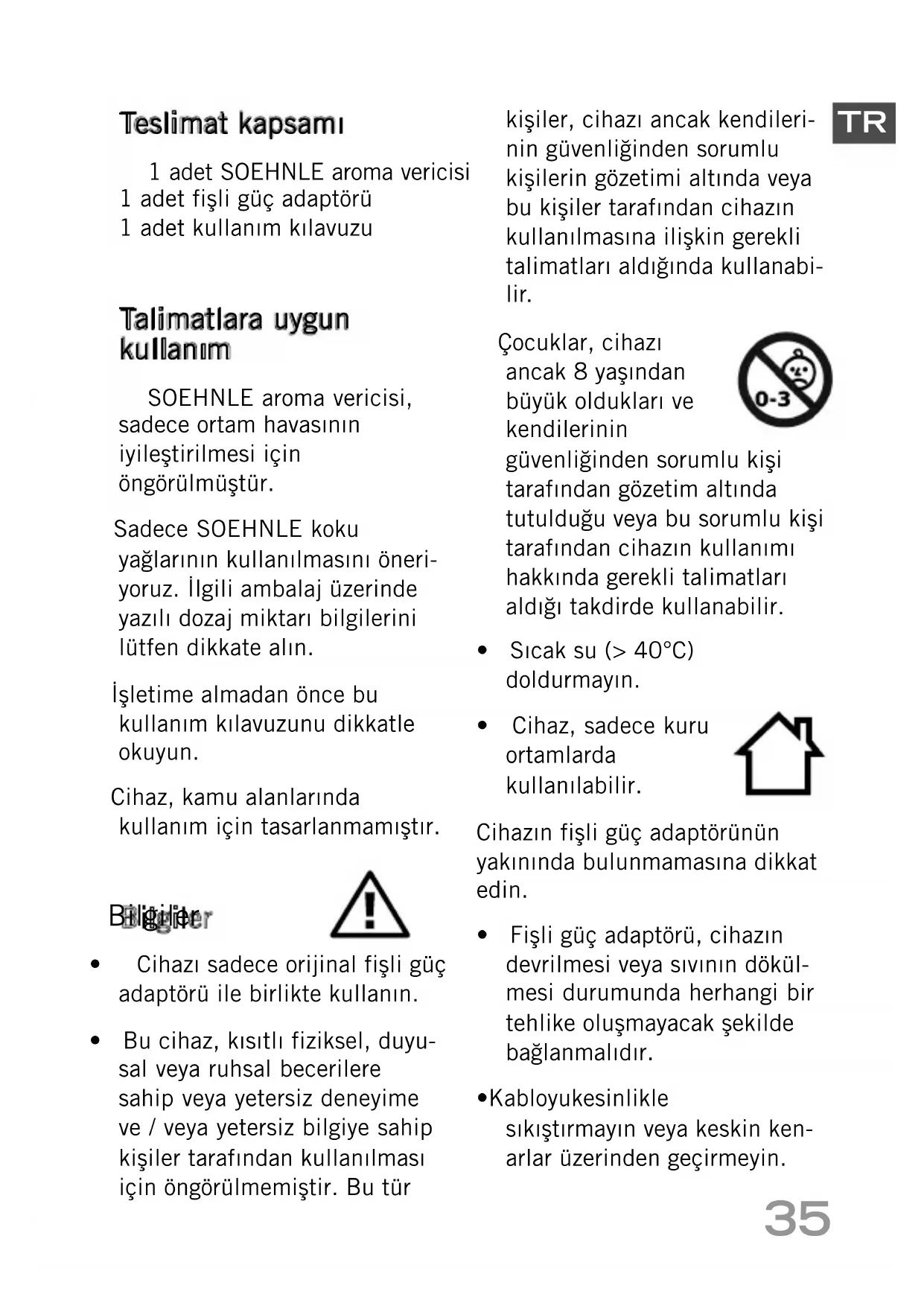 Teslimat kapsamı 1 adet SOEHNLE aroma vericisi 1 adet fişli güç adaptörü 1 adet kullanım kılavuzu Talimatlara uygun kullanım SOEHNLE aroma vericisi, sadece ortam havasının iyileştirilmesi için öngörülmüştür. Sadece SOEHNLE koku yağlarının kullanılmasını öneri- yoruz. İlgili ambalaj üzerinde yazılı dozaj miktarı bilgilerini lütfen dikkate alın. İşletime almadan önce bu kullanım kılavuzunu dikkatle okuyun. Cihaz, kamu alanlarında kullanım için tasarlanmamıştır. Bilgiler