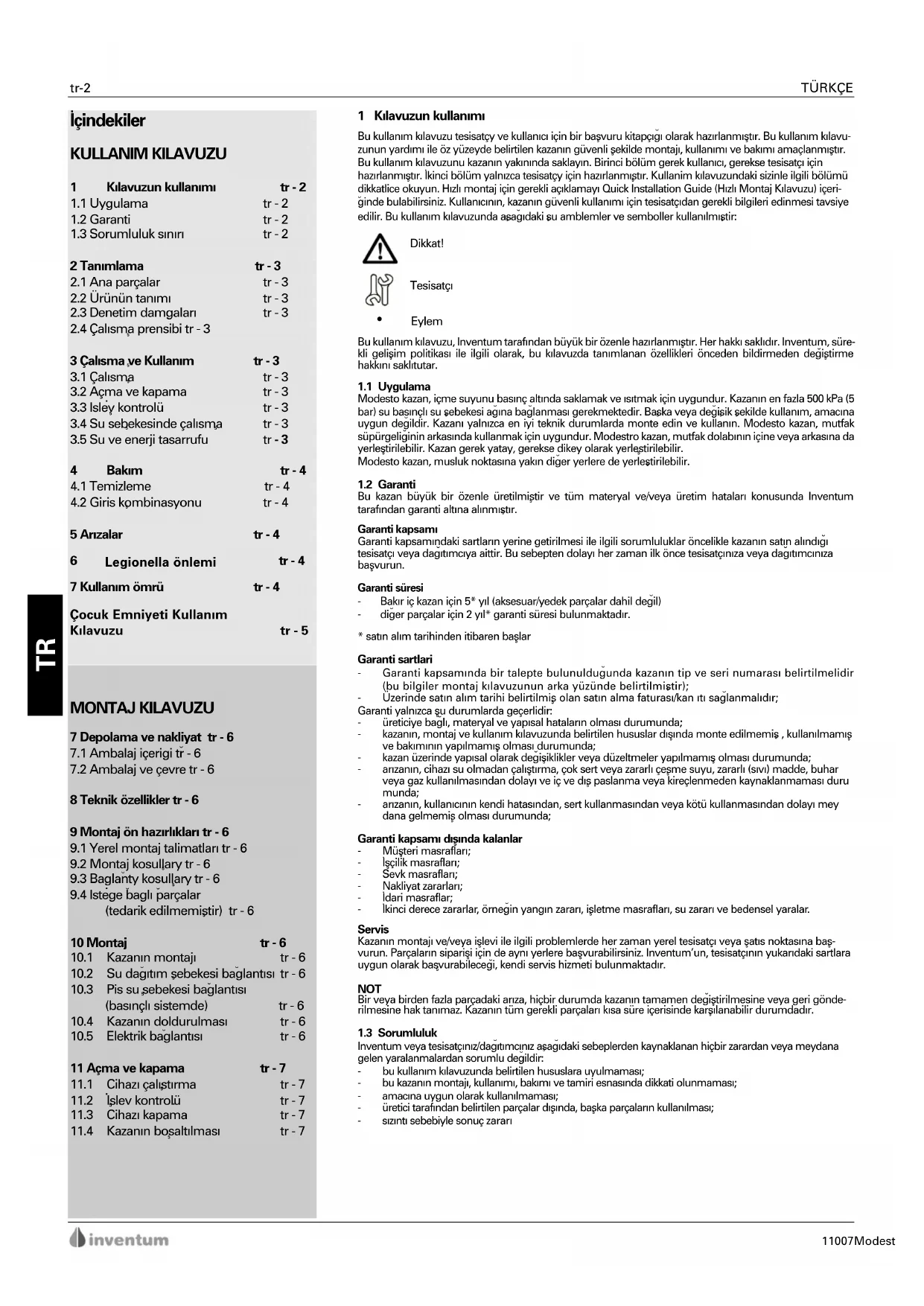 Inventum veya tesisatçınız/dagıtımcınız asagıdaki sebeplerden kaynaklanan hiçbir zarardan veya meydanagelen yaralanmalardan sorumlu degildir:- bu kullanım kılavuzunda belirtilen hususlara uyulmaması;- bu kazanın montajı, kullanımı, bakımı ve tamiri esnasında dikkati olunmaması;- amacına uygun olarak kullanılmaması;- üretici tarafından belirtilen parçalar dısında, baska parçaların kullanılması;- sızıntı sebebiyle sonuç zararı Içindekiler KULLANIM KILAVUZU 1 Kılavuzun kullanımı tr - 2