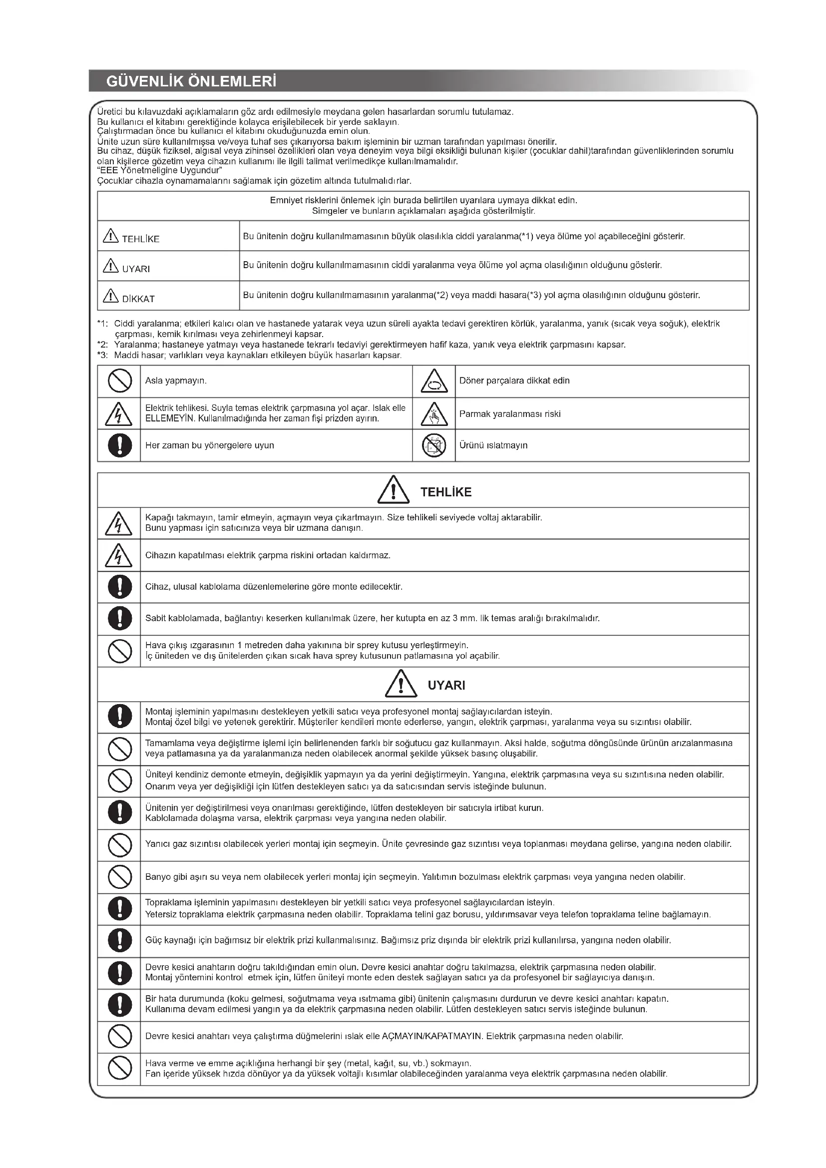 Hava verme ve emme açıklığına herhangi bir şey (metal, kağıt, su, vb.) sokmayın. Fan içeride yüksek hızda dönüyor ya da yüksek voltajlı kısımlar olabileceğinden yaralanma veya elektrik çarpmasına neden olabilir.2 Klima ünitesi soğutmuyor veya ısıtmıyorsa, soğutucu sızıntısı olabilir. Lütfen destek sağlayan bir satıcıya danışın. Klima ünitesinde kullanılan soğutucu gaz güvenlidir. Normal kullanım koşullarında sızıntı yapmaz, ancak odaya sızarsa ve ısıtıcı ya da soba gibi ısı kaynaklarıyla temas ederse zararlı bir reaksiyona neden olabilir.