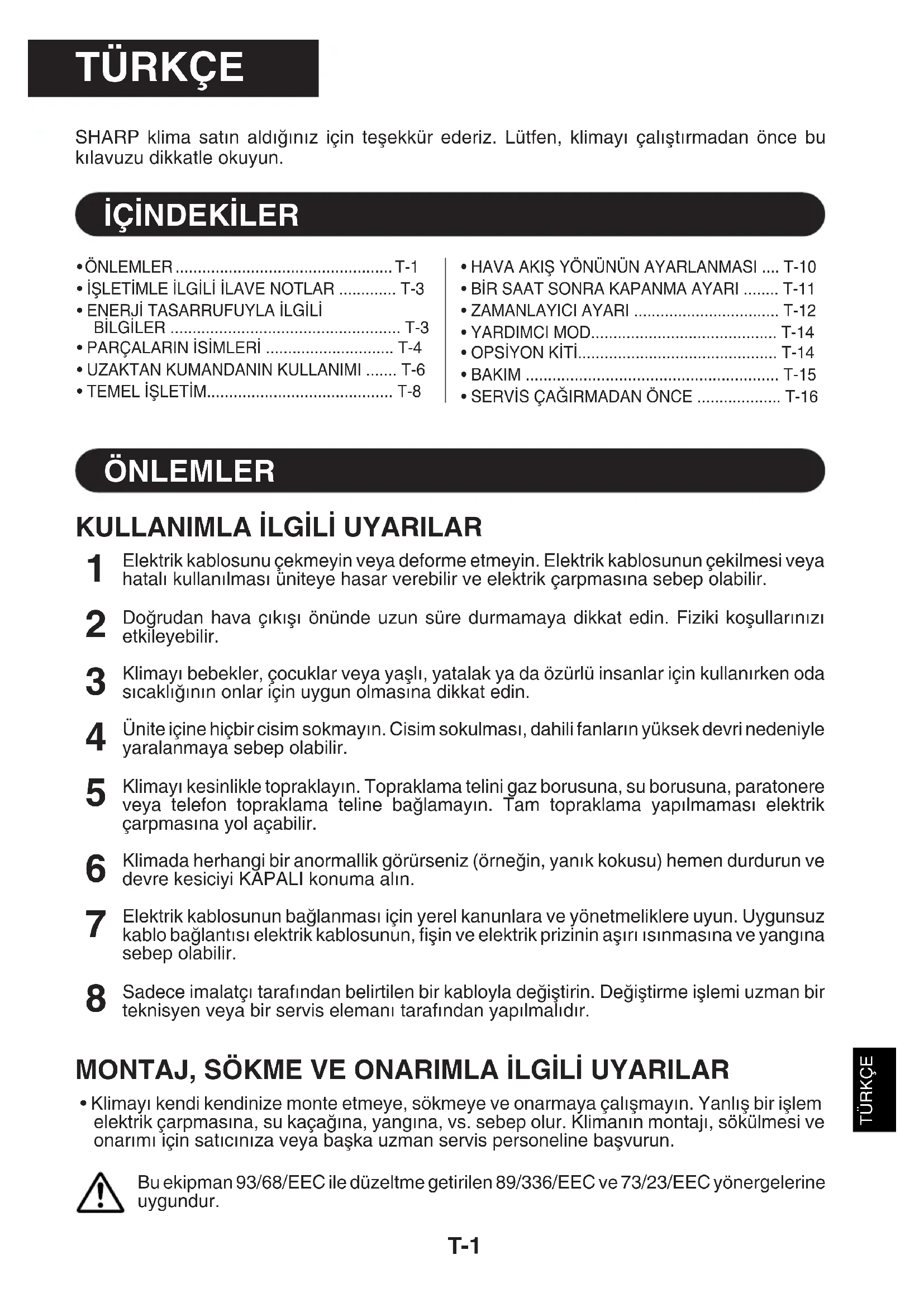 - ÖNLEMLER ................................................. T-1• ∑ΩLET∑MLE ∑LG∑L∑ ∑LAVE NOTLAR ............. T-3• ENERJ∑ TASARRUFUYLA ∑LG∑L∑B∑LG∑LER .................................................... T-3• PARÇALARIN ∑S∑MLER∑ ............................. T-4• UZAKTAN KUMANDANIN KULLANIMI ....... T-6• TEMEL ∑ΩLET∑M.......................................... T-8T-2 ÖNLEMLER