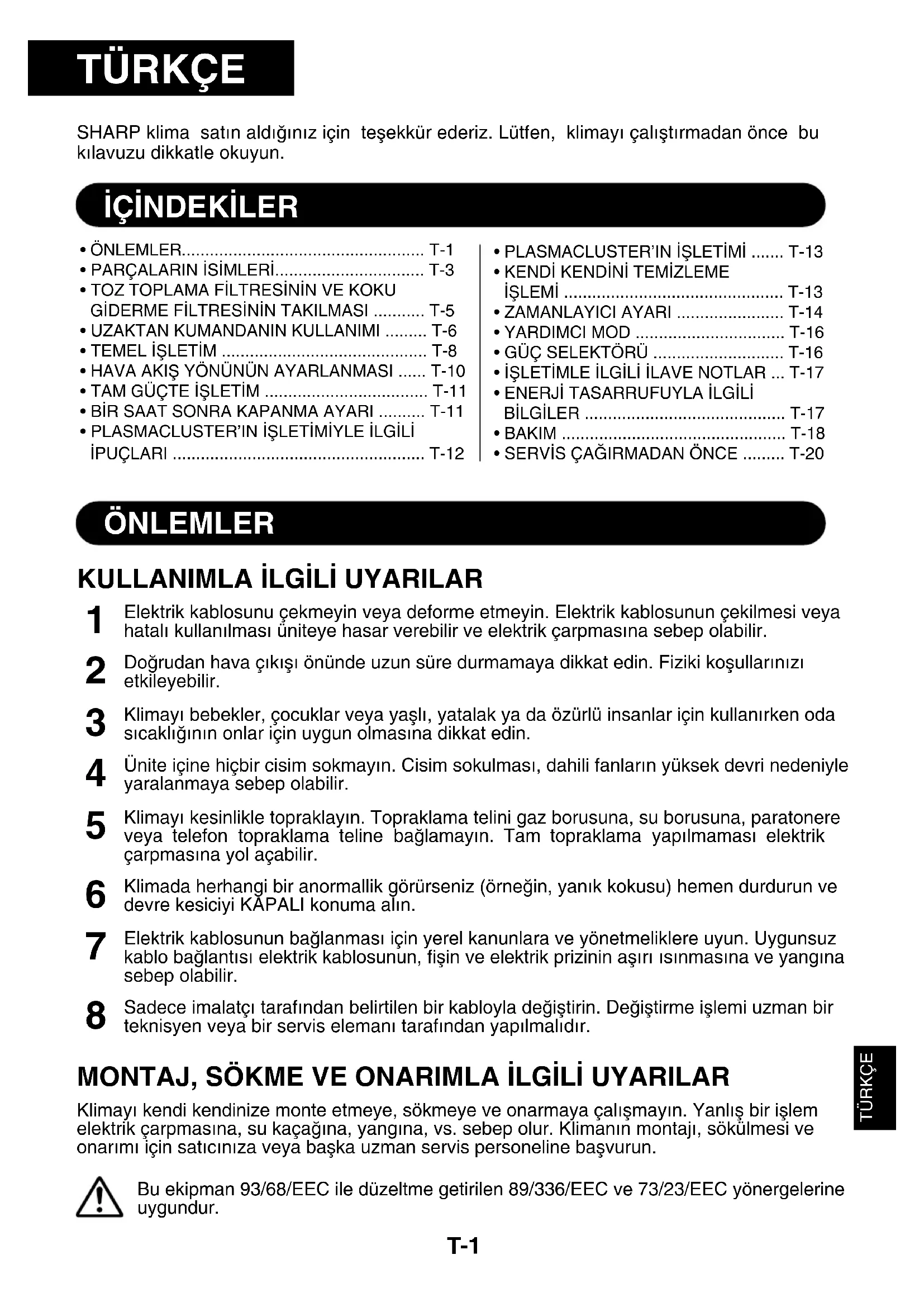 Elektrik kablosunu çekmeyin veya deforme etmeyin. Elektrik kablosunun çekilmesi veyahatalı kullanılması üniteye hasar verebilir ve elektrik çarpmasına sebep olabilir. Doπrudan hava çıkıµı önünde uzun süre durmamaya dikkat edin. Fiziki koµullarınızıetkileyebilir. Klimayı bebekler, çocuklar veya yaµlı, yatalak ya da özürlü insanlar için kullanırken odasıcaklıπının onlar için uygun olmasına dikkat edin. Ünite içine hiçbir cisim sokmayın. Cisim sokulması, dahili fanların yüksek devri nedeniyleyaralanmaya sebep olabilir. Klimayı kesinlikle topraklayın. Topraklama telini gaz borusuna, su borusuna, paratonere veya telefon topraklama teline baπlamayın. Tam topraklama yapılmaması elektrik çarpmasına yol açabilir. Klimada herhangi bir anormallik görürseniz (örneπin, yanık kokusu) hemen durdurun vedevre kesiciyi KAPALI konuma alın. Elektrik kablosunun baπlanması için yerel kanunlara ve yönetmeliklere uyun. Uygunsuzkablo baπlantısı elektrik kablosunun, fiµin ve elektrik prizinin aµırı ısınmasına ve yangınasebep olabilir. Sadece imalatçı tarafından belirtilen bir kabloyla deπiµtirin. Deπiµtirme iµlemi uzman birteknisyen veya bir servis elemanı tarafından yapılmalıdır. MONTAJ, SÖKME VE ONARIMLA ∑LG∑L∑ UYARILAR Klimayı kendi kendinize monte etmeye, sökmeye ve onarmaya çalıµmayın. Yanlıµ bir iµlemelektrik çarpmasına, su kaçaπına, yangına, vs. sebep olur. Klimanın montajı, sökülmesi veonarımı için satıcınıza veya baµka uzman servis personeline baµvurun.Bu ekipman 93/68/EEC ile düzeltme getirilen 89/336/EEC ve 73/23/EEC yönergelerineuygundur. ÖNLEMLER SHARP klima sat∂n ald∂πınız için teµekkür ederiz. Lütfen, klimayı çalıµtırmadan önce bukılavuzu dikkatle okuyun.
