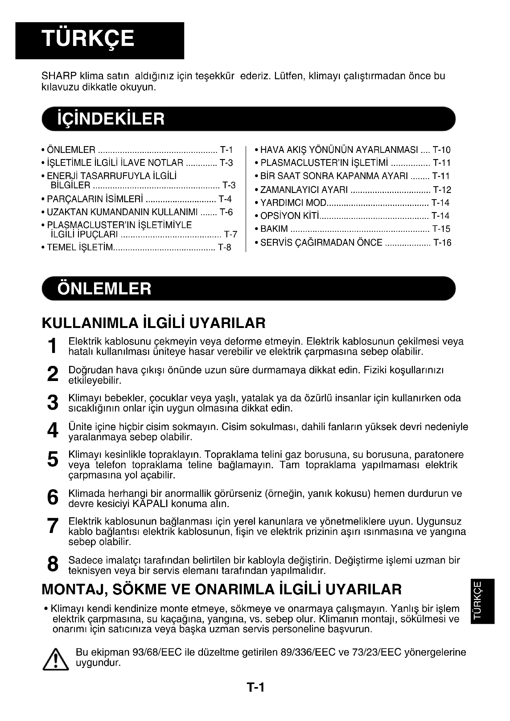 - ÖNLEMLER ................................................. T-1• ∑ΩLET∑MLE ∑LG∑L∑ ∑LAVE NOTLAR ............. T-3• ENERJ∑ TASARRUFUYLA ∑LG∑L∑B∑LG∑LER .................................................... T-3• PARÇALARIN ∑S∑MLER∑ ............................. T-4• UZAKTAN KUMANDANIN KULLANIMI ....... T-6• PLASMACLUSTER’IN ∑ΩLET∑M∑YLE∑LG∑L∑ ∑PUÇLARI ......................................... T-7• TEMEL ∑ΩLET∑M.......................................... T-8T-2 ÖNLEMLER
