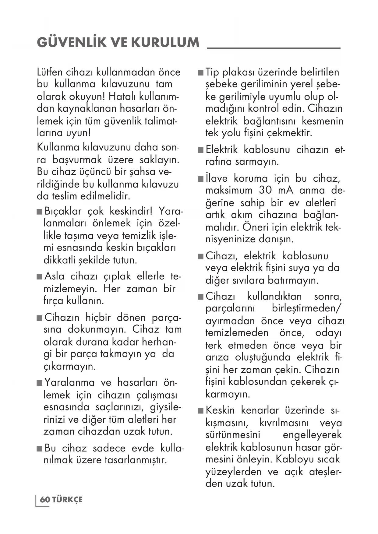 Lütfen cihazı kullanmadan önce bu kullanma kılavuzunu tam olarak okuyun! Hatalı kullanım- dan kaynaklanan hasarları ön- lemek için tüm güvenlik talimat- larına uyun! Kullanma kılavuzunu daha son- ra başvurmak üzere saklayın. Bu cihaz üçüncü bir şahsa ve- rildiğinde bu kullanma kılavuzu da teslim edilmelidir. ■ Bıçaklar çok keskindir! Yara- lanmaları önlemek için özel- likle taşıma veya temizlik işle- mi esnasında keskin bıçakları dikkatli şekilde tutun. ■ Asla cihazı çıplak ellerle te- mizlemeyin. Her zaman bir fırça kullanın. ■ Cihazın hiçbir dönen parça- sına dokunmayın. Cihaz tam olarak durana kadar herhan- gi bir parça takmayın ya da çıkarmayın. ■ Yaralanma ve hasarları ön- lemek için cihazın çalışması esnasında saçlarınızı, giysile- rinizi ve diğer tüm aletleri her zaman cihazdan uzak tutun. ■ Bu cihaz sadece evde kulla- nılmak üzere tasarlanmıştır. ■ Tip plakası üzerinde belirtilen şebeke geriliminin yerel şebe- ke gerilimiyle uyumlu olup ol- madığını kontrol edin. Cihazın elektrik bağlantısını kesmenin tek yolu fişini çekmektir. ■ Elektrik kablosunu cihazın et- rafına sarmayın. ■ İlave koruma için bu cihaz, maksimum 30 mA anma de- ğerine sahip bir ev aletleri artık akım cihazına bağlan- malıdır. Öneri için elektrik tek- nisyeninize danışın. ■ Cihazı, elektrik kablosunu veya elektrik fişini suya ya da diğer sıvılara batırmayın. ■ Cihazı kullandıktan sonra, parçalarını birleştirmeden/ ayırmadan önce veya cihazı temizlemeden önce, odayı terk etmeden önce veya bir arıza oluştuğunda elektrik fi- şini her zaman çekin. Cihazın fişini kablosundan çekerek çı- karmayın. ■ Keskin kenarlar üzerinde sı- kışmasını, kıvrılmasını veya sürtünmesini engelleyerek elektrik kablosunun hasar gör- mesini önleyin. Kabloyu sıcak yüzeylerden ve açık ateşler- den uzak tutun.61