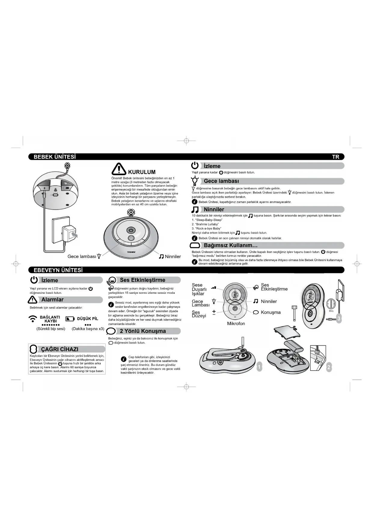 3. Tüm uygulanabilir AB Komisyonu Direktiflerinin tüm uygulanabilir temel gereksinimleri ile uyumlu olduğunu; Referans standartlarının listesi: EN60950-1: 2006, EN62471: 2008, EN62479: 2010, EN301 406, EN301 489-1, EN301 489-6. AB genelinde kullanımına izin verilmiştir. Bu beyan TOMY Europe, Hembury House, Exeter, EX2 5AZ, UK’nın tamamen kendi sorumluluğunda yayınlanmıştır. İNGİLTERE. Tomy Bebek İzleyicisi, çocuğunuzu izlemenize yardımcı olması amacı ile tasarlanmıştır ve yetişkin gözetimi için bir alternatif değildir. Bu ürün bir oyuncak değildir. Elektrik ile çalışan eşyaları ve kablolarını her zaman bebeklerden ve küçük çocukların ulaşabileceği yerlerden uzak tutun. İzleyicinizin herhangi bir parçasını asla bebek yatağının içine ya da üstüne yerleştirmeyin. Tüm kabloların güvenli bir şekilde yerleştiğinden emin olun, böylece çocuklar kablolara dolanamaz ve hiçbir şekilde takılıp düşme tehlikesi yaşanmaz. Bu izleyici ile birlikte verilen adaptörler asla diğer ekipmanlar ile kullanılamaz. Size verilen adaptörlerden başka hiçbir adaptör izleyiciniz ile beraber kullanılmamalıdır. Adaptörü çocuğunuzun basamak olarak kullanabileceği yerlere koymamaya dikkat edin. Fişe takılı iken adaptörün üstüne ağırlık koymak cihaza zarar verebilir ya da çocuğunuzun yaralanmasına neden olabilir. Şarj aletlerinin kullanım sırasında ısınması normaldir – tutarken dikkatli olun, ısının dağılmasına izin verin. ÜSTÜNÜ ÖRTMEYİN. Ürün birkaç gün boyunca kullanılmayacak ise şarj aletini çıkarın. Elektrik çarpmasını önlemek için, lütfen temizlemeden önce güç kaynağını çıkarın. Ebeveyn Ünitesindeki yeniden şarj edilebilen pil geri dönüştürülmelidir. Normal atıklar ile birlikte atmayın. Bu ürünün herhangi bir parçasını sökmeye çalışmayın.