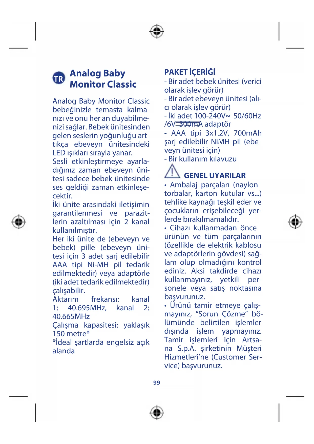 Analog Baby Monitor Classic Analog Baby Monitor Classic bebeğinizle temasta kalma- nızı ve onu her an duyabilme- nizi sağlar. Bebek ünitesinden gelen seslerin yoğunluğu art- tıkça ebeveyn ünitesindeki LED ışıkları sırayla yanar. Sesli etkinleştirmeye ayarla- dığınız zaman ebeveyn üni- tesi sadece bebek ünitesinde ses geldiği zaman etkinleşe- cektir. İki ünite arasındaki iletişimin garantilenmesi ve parazit- lerin azaltılması için 2 kanal kullanılmıştır. Her iki ünite de (ebeveyn ve bebek) pille (ebeveyn üni- tesi için 3 adet şarj edilebilir AAA tipi Ni-MH pil tedarik edilmektedir) veya adaptörle (iki adet tedarik edilmektedir) çalışabilir. Aktarım frekansı: kanal 1: 40.695MHz, kanal 2: 40.665MHz Çalışma kapasitesi: yaklaşık 150 metre* *İdeal şartlarda engelsiz açık alanda PAKET İÇERİĞİ - Bir adet bebek ünitesi (verici olarak işlev görür) - Bir adet ebeveyn ünitesi (alı- cı olarak işlev görür) - İki adet 100-240V~ 50/60Hz /6V 300mA adaptör - AAA tipi 3x1.2V, 700mAh şarj edilebilir NiMH pil (ebe- veyn ünitesi için) - Bir kullanım kılavuzu GENEL UYARILAR