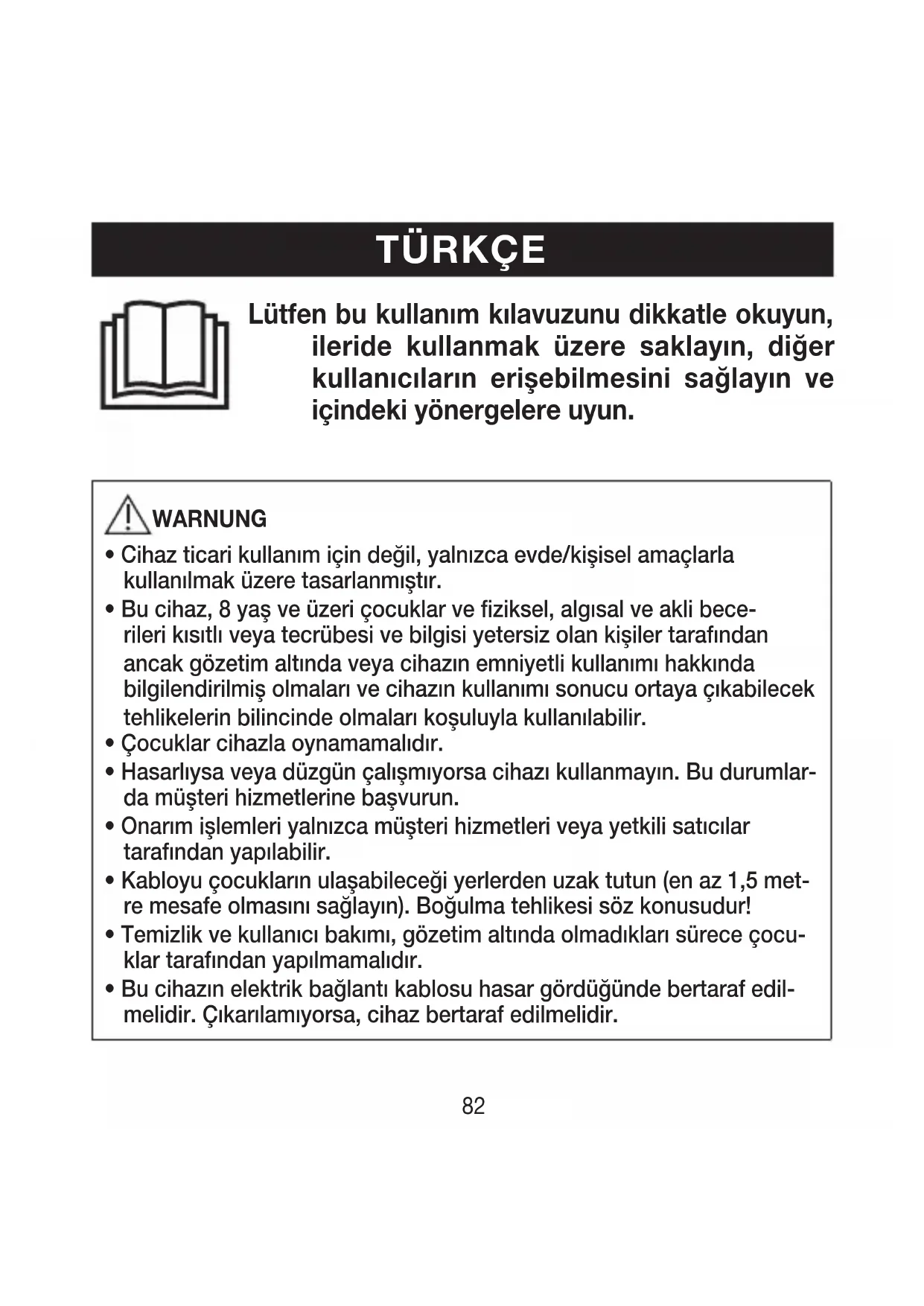 Lütfen bu kullanım kılavuzunu dikkatle okuyun, ileride kullanmak üzere saklayın, diğer kullanıcıların erişebilmesini sağlayın ve içindeki yönergelere uyun. WARNUNG