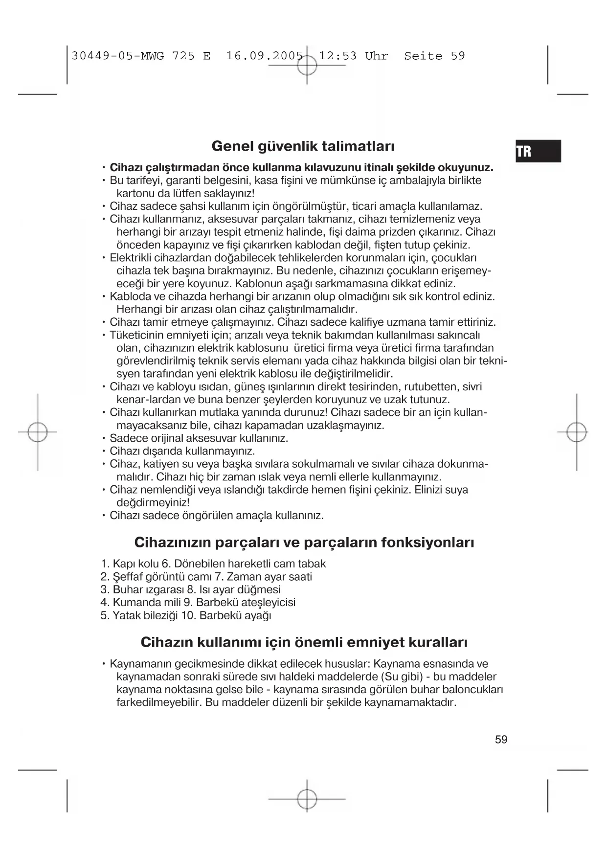 - Cihazı sadece öngörülen amaçla kullanınız. Cihazınızın parçaları ve parçaların fonksiyonları