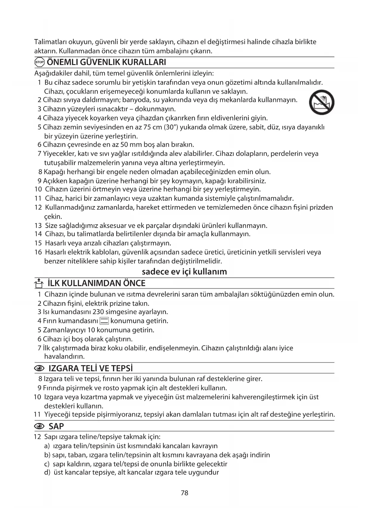Aşağıdakiler dahil, tüm temel güvenlik önlemlerini izleyin: 1 Bu cihaz sadece sorumlu bir yetişkin tarafından veya onun gözetimi altında kullanılmalıdır. Cihazı, çocukların erişemeyeceği konumlarda kullanın ve saklayın. 2 Cihazı sıvıya daldırmayın; banyoda, su yakınında veya dış mekanlarda kullanmayın. 3 Cihazın yüzeyleri ısınacaktır – dokunmayın. 4 Cihaza yiyecek koyarken veya çihazdan çıkarırken fırın eldivenlerini giyin. 5 Cihazı zemin seviyesinden en az 75 cm (30”) yukarıda olmak üzere, sabit, düz, ısıya dayanıklı bir yüzeyin üzerine yerleştirin. 6 Cihazın çevresinde en az 50 mm boş alan bırakın. 7 Yiyecekler, katı ve sıvı yağlar ısıtıldığında alev alabilirler. Cihazı dolapların, perdelerin veya tutuşabilir malzemelerin yanına veya altına yerleştirmeyin. 8 Kapağı herhangi bir engele neden olmadan açabileceğinizden emin olun. 9 Açıkken kapağın üzerine herhangi bir şey koymayın, kapağı kırabilirsiniz. 10 Cihazın üzerini örtmeyin veya üzerine herhangi bir şey yerleştirmeyin. 11 Cihaz, harici bir zamanlayıcı veya uzaktan kumanda sistemiyle çalıştırılmamalıdır. 12 Kullanmadığınız zamanlarda, hareket ettirmeden ve temizlemeden önce cihazın fişini prizden çekin. 13 Size sağladığımız aksesuar ve ek parçalar dışındaki ürünleri kullanmayın. 14 Cihazı, bu talimatlarda belirtilenler dışında bir amaçla kullanmayın. 15 Hasarlı veya arızalı cihazları çalıştırmayın. 16 Hasarlı elektrik kabloları, güvenlik açısından sadece üretici, üreticinin yetkili servisleri veya benzer niteliklere sahip kişiler tarafından değiştirilmelidir. sadece ev içi kullanım