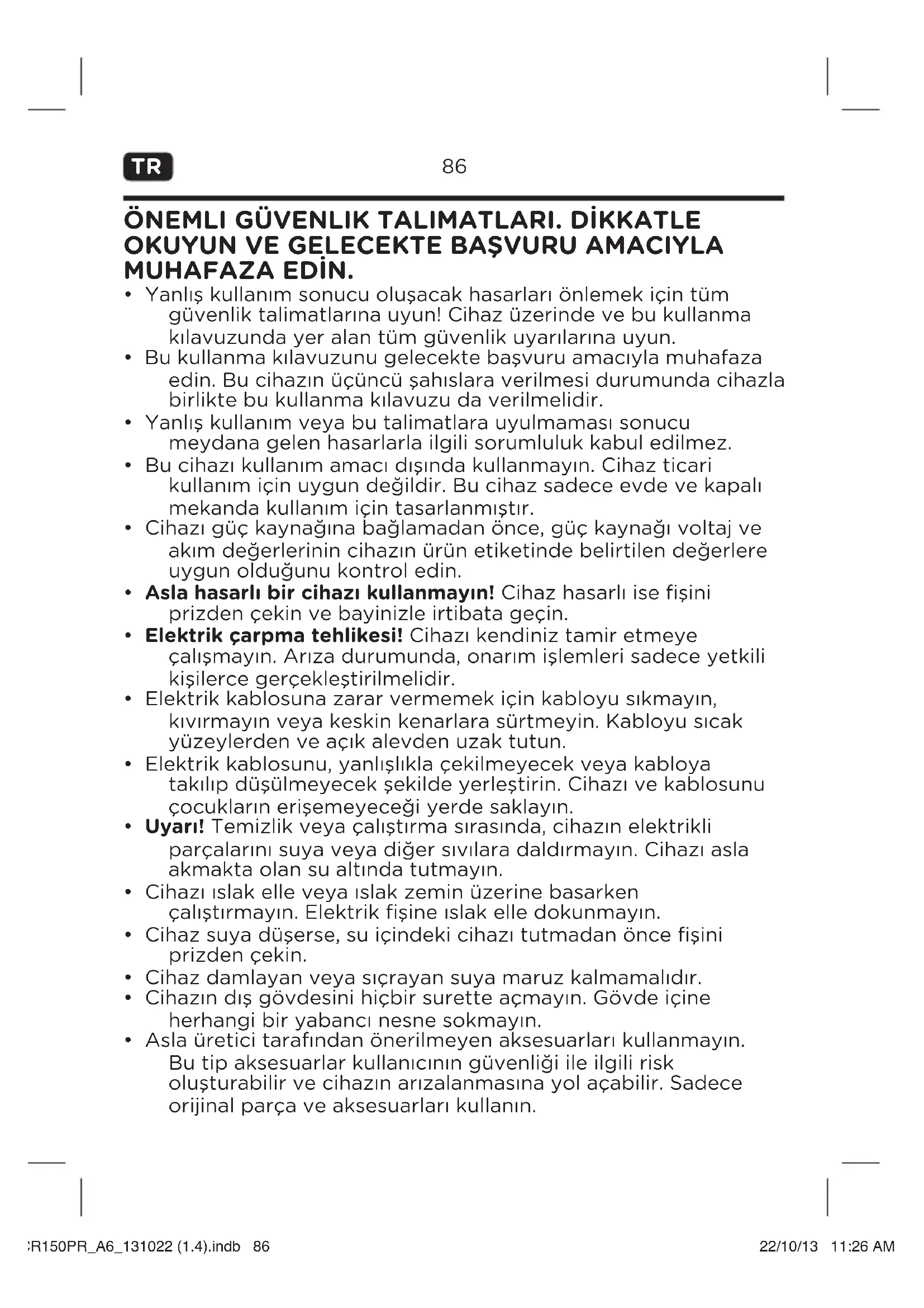 - Asla üretici tarafından önerilmeyen aksesuarları kullanmayın. Bu tip aksesuarlar kullanıcının güvenliği ile ilgili risk oluşturabilir ve cihazın arızalanmasına yol açabilir. Sadece orijinal parça ve aksesuarları kullanın. OCR150PR_A6_131022 (1.4).indb 86CR150PR_A6_131022 (1.4).indb 86 22/10/13 11:26 AM22/10/13 11:26 AMTR