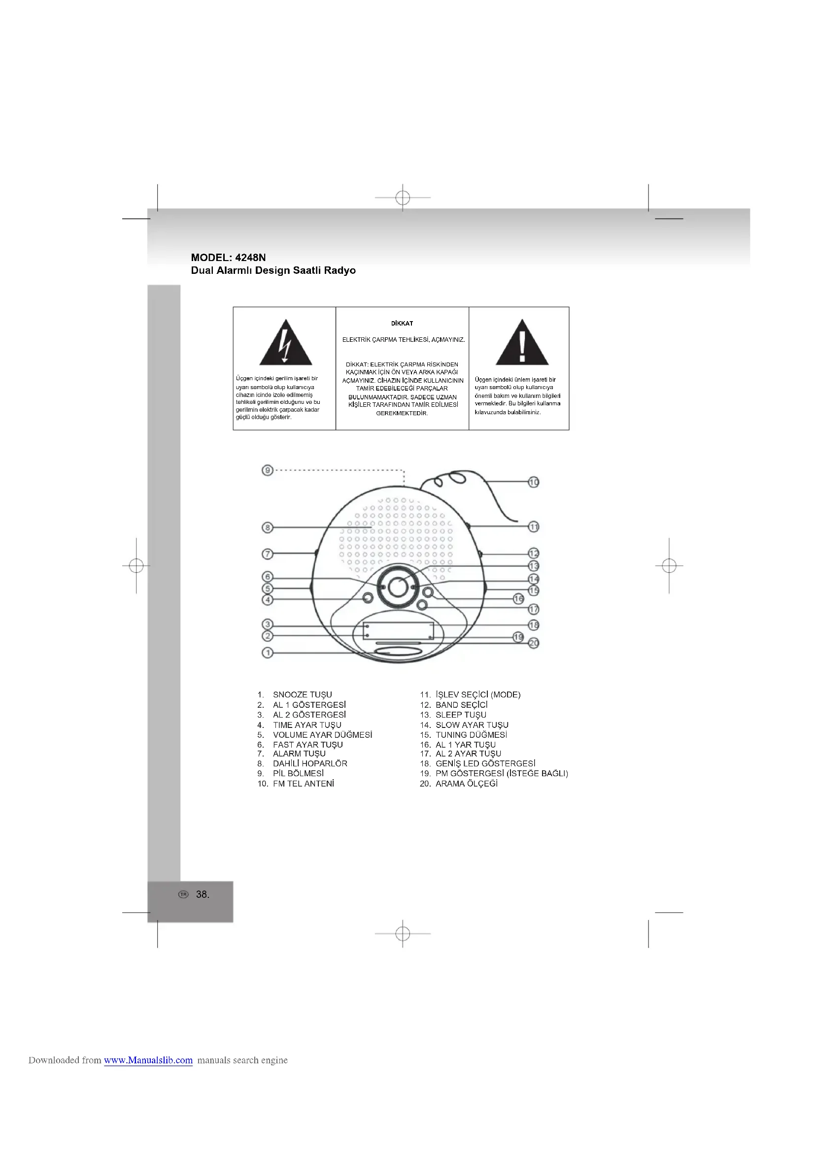 Üçgen içindeki gerilim işareti bir uyarı sembolü olup kullanıcıya cihazın icinde izole edilmemiş tehlikeli gerilimin olduğunu ve bu gerilimin elektrik çarpacak kadar güçlü olduğu gösterir.DİKKATELEKTRİK ÇARPMA TEHLİKESİ, AÇMAYINIZ.DİKKAT: ELEKTRİK ÇARPMA RİSKİNDEN KAÇINMAK İÇİN ÖN VEYA ARKA KAPAĞI AÇMAYINIZ. CİHAZIN İÇİNDE KULLANICININ TAMİR EDEBİLECEĞİ PARÇALAR BULUNMAMAKTADIR. SADECE UZMAN KİŞİLER TARAFINDAN TAMİR EDİLMESİ GEREKMEKTEDİR.Üçgen içindeki ünlem işareti bir uyarı sembolü olup kullanıcıya önemli bakım ve kullanım bilgileri vermektedir. Bu bilgileri kullanma kılavuzunda bulabilirsiniz. Downloaded from www.Manualslib.com manuals search engineGÜÇ KAYNAĞI Bu cihaz ana şehir ceryanıyla çalışır. Saat ve alarm işlevleri DC yedeğini kulanır, pil: 1 x 9V (dahil değildir).