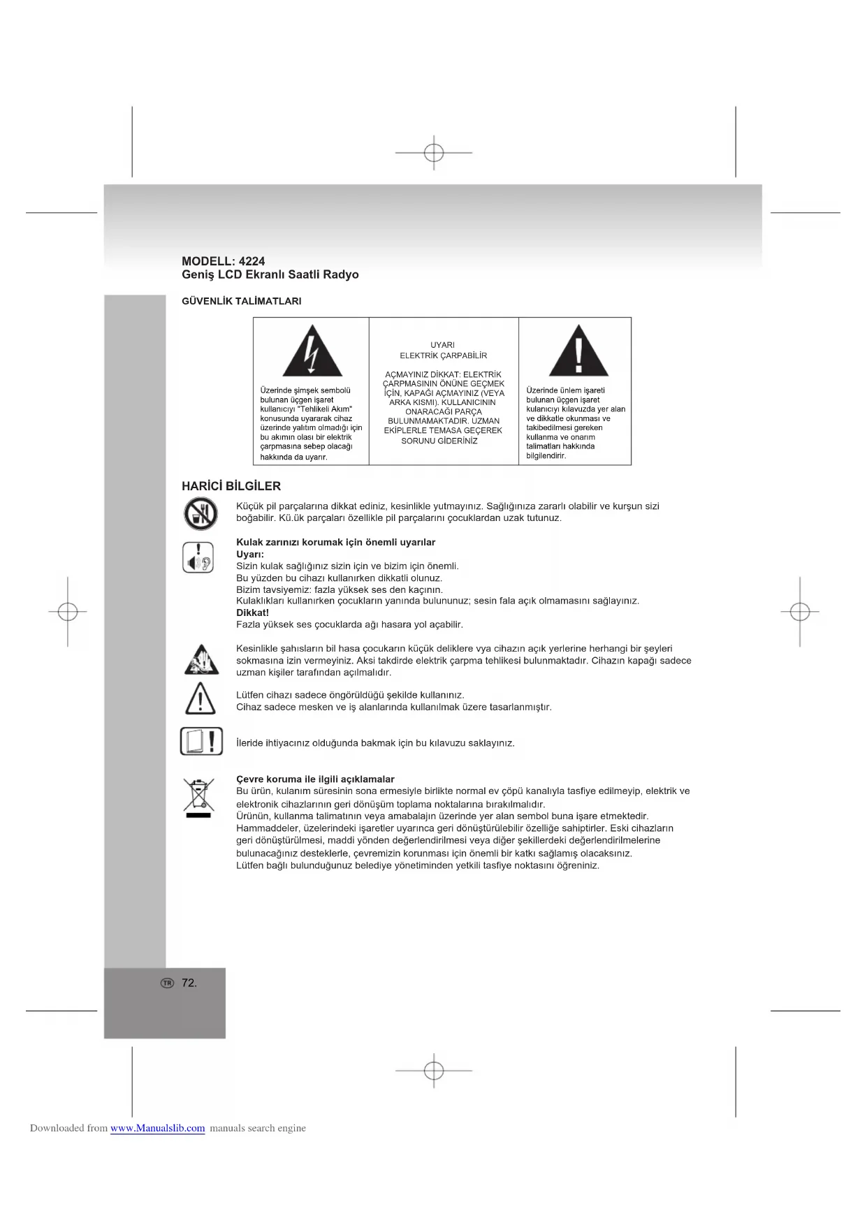 UYARIELEKTRİK ÇARPABİLİR AÇMAYINIZ DİKKAT: ELEKTRİK ÇARPMASININ ÖNÜNE GEÇMEK İÇİN, KAPAĞI AÇMAYINIZ (VEYA ARKA KISMI). KULLANICININ ONARACAĞI PARÇA BULUNMAMAKTADIR. UZMAN EKİPLERLE TEMASA GEÇEREK SORUNU GİDERİNİZ Downloaded from www.Manualslib.com manuals search engine73. Cihazın havalandırma deliklerini gazete, perde yorgan veya mobilya ile tıkamayınız. Havalandırma delikleri her zaman açık kaması gerekmektedir. Fazla ısınma cihazın fazla ısınmasına sebep olabilir veya cihazın ömrünü kısaltır.Sıcaklık ve ısıCihazı güneş ışığının doğrudan yansımasından koruyunuz. Cihazın doğrudan sıcaklık üreten aletelerde kalirüfer gibi açık ateşten vs. uzak tutunuz. Cihazın havalandırma deliklerinin kapalı olmadığından emin olunuz.Rutubet ve temizlikBu cihaz su geçirmez değildir! Cihazı suyla temas ettirmeyiniz. Cihazın su alabileceği yerlerden uzak tutunuz. Cihaza su girerse şayet, ciddi hasara neden olabilir. Cihazı temizlemek için içinde alkol, benzen veya cihazın dış yüzeylerine zarar verecek maddelerin bulunduğu çözücü maddeler kullanmayınız. Bunun yerine, yumuşak, ve nemli bir bez kullanınız.Uygun biçimde arıtmaPil ve ambalajlar normal çöpe atılmaması gerekmektedir. Piller için özel bulunan yerlerde arıtılması gerekmektedir. Ambalajları ayrı atmanız çevreyi korumanıza yardımcı olur.