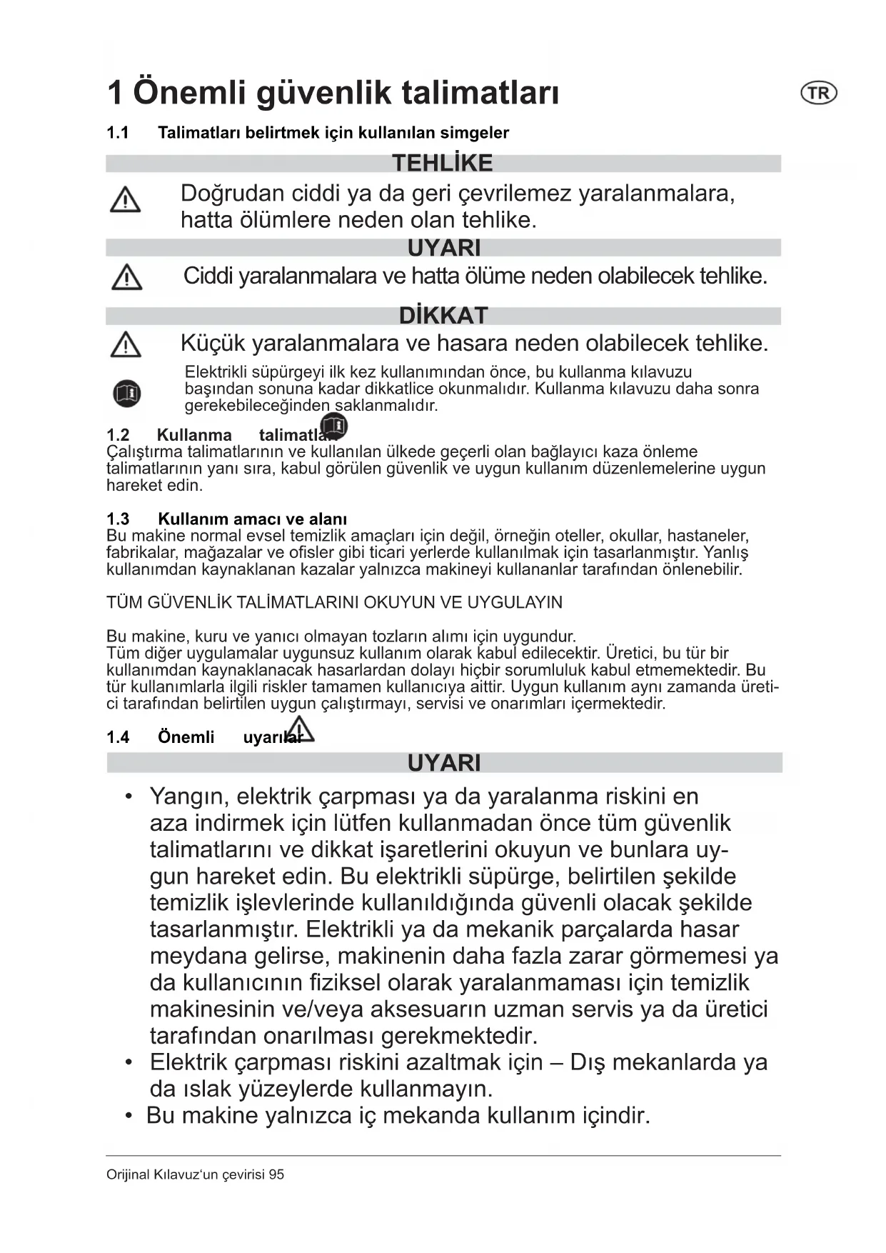 - Yangın, elektrik çarpması ya da yaralanma riskini en aza indirmek için lütfen kullanmadan önce tüm güvenlik talimatlarını ve dikkat işaretlerini okuyun ve bunlara uy- gun hareket edin. Bu elektrikli süpürge, belirtilen şekilde temizlik işlevlerinde kullanıldığında güvenli olacak şekilde tasarlanmıştır. Elektrikli ya da mekanik parçalarda hasar meydana gelirse, makinenin daha fazla zarar görmemesi ya da kullanıcının fiziksel olarak yaralanmaması için temizlik makinesinin ve/veya aksesuarın uzman servis ya da üretici tarafından onarılması gerekmektedir.
