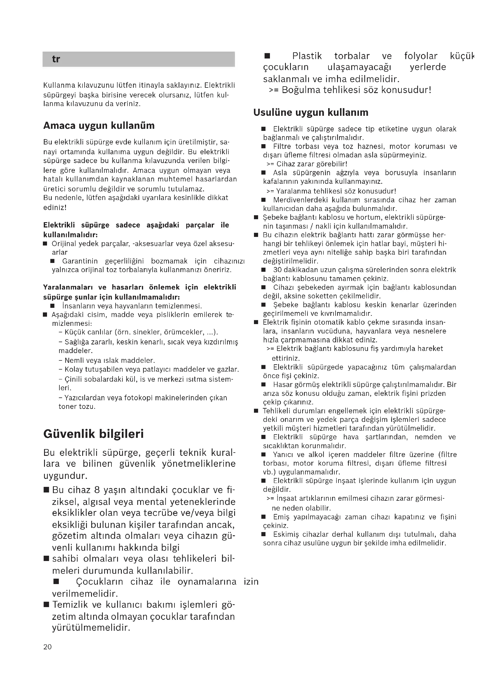 Kullanma kılavuzunu lütfen itinayla saklayınız. Elektrikli süpürgeyi başka birisine verecek olursanız, lütfen kul- lanma kılavuzunu da veriniz. Amaca uygun kullanűm Bu elektrikli süpürge evde kullanım için üretilmiştir, sa- nayi ortamında kullanıma uygun değildir. Bu elektrikli süpürge sadece bu kullanma kılavuzunda verilen bilgi- lere göre kullanılmalıdır. Amaca uygun olmayan veya hatalı kullanımdan kaynaklanan muhtemel hasarlardan üretici sorumlu değildir ve sorumlu tutulamaz. Bu nedenle, lütfen aşağıdaki uyarılara kesinlikle dikkat ediniz! Elektrikli süpürge sadece aşağıdaki parçalar ile kullanılmalıdır: Orijinal yedek parçalar, -aksesuarlar veya özel aksesu- arlar Garantinin geçerliliğini bozmamak için cihazınızı yalnızca orijinal toz torbalarıyla kullanmanızı öneririz. Yaralanmaları ve hasarları önlemek için elektrikli süpürge şunlar için kullanılmamalıdır: İnsanların veya hayvanların temizlenmesi. Aşağıdaki cisim, madde veya pisliklerin emilerek te- mizlenmesi: − Küçük canlılar (örn. sinekler, örümcekler, ...). − Sağlığa zararlı, keskin kenarlı, sıcak veya kızdırılmış maddeler. − Nemli veya ıslak maddeler. − Kolay tutuşabilen veya patlayıcı maddeler ve gazlar. − Çinili sobalardaki kül, is ve merkezi ısıtma sistem- leri. − Yazıcılardan veya fotokopi makinelerinden çıkan toner tozu. Güvenlik bilgileri Bu elektrikli süpürge, geçerli teknik kural- lara ve bilinen güvenlik yönetmeliklerine uygundur. Bu cihaz 8 yaşın altındaki çocuklar ve fi- ziksel, algısal veya mental yeteneklerinde eksiklikler olan veya tecrübe ve/veya bilgi eksikliği bulunan kişiler tarafından ancak, gözetim altında olmaları veya cihazın gü- venli kullanımı hakkında bilgi sahibi olmaları veya olası tehlikeleri bil- meleri durumunda kullanılabilir. Çocukların cihaz ile oynamalarına izin verilmemelidir. Temizlik ve kullanıcı bakımı işlemleri gö- zetim altında olmayan çocuklar tarafından yürütülmemelidir. Plastik torbalar ve folyolar küçük çocukların ulaşamayacağı yerlerde saklanmalı ve imha edilmelidir. >= Boğulma tehlikesi söz konusudur! Usulüne uygun kullanım Elektrikli süpürge sadece tip etiketine uygun olarak bağlanmalı ve çalıştırılmalıdır. Filtre torbası veya toz haznesi, motor koruması ve dışarı üfleme filtresi olmadan asla süpürmeyiniz. >= Cihaz zarar görebilir! Asla süpürgenin ağzıyla veya borusuyla insanların kafalarının yakınında kullanmayınız. >= Yaralanma tehlikesi söz konusudur! Merdivenlerdeki kullanım sırasında cihaz her zaman kullanıcıdan daha aşağıda bulunmalıdır. Şebeke bağlantı kablosu ve hortum, elektrikli süpürge- nin taşınması / nakli için kullanılmamalıdır. Bu cihazın elektrik bağlantı hattı zarar görmüşse her- hangi bir tehlikeyi önlemek için hatlar bayi, müşteri hi- zmetleri veya aynı niteliğe sahip başka biri tarafından değiştirilmelidir. 30 dakikadan uzun çalışma sürelerinden sonra elektrik bağlantı kablosunu tamamen çekiniz. Cihazı şebekeden ayırmak için bağlantı kablosundan değil, aksine soketten çekilmelidir. Şebeke bağlantı kablosu keskin kenarlar üzerinden geçirilmemeli ve kıvrılmamalıdır. Elektrik fişinin otomatik kablo çekme sırasında insan- lara, insanların vucüduna, hayvanlara veya nesnelere hızla çarpmamasına dikkat ediniz. >= Elektrik bağlantı kablosunu fiş yardımıyla hareket ettiriniz. Elektrikli süpürgede yapacağınız tüm çalışmalardan önce fişi çekiniz. Hasar görmüş elektrikli süpürge çalıştırılmamalıdır. Bir arıza söz konusu olduğu zaman, elektrik fişini prizden çekip çıkarınız. Tehlikeli durumları engellemek için elektrikli süpürge- deki onarım ve yedek parça değişim işlemleri sadece yetkili müşteri hizmetleri tarafından yürütülmelidir. Elektrikli süpürge hava şartlarından, nemden ve sıcaklıktan korunmalıdır. Yanıcı ve alkol içeren maddeler filtre üzerine (filtre torbası, motor koruma filtresi, dışarı üfleme filtresi vb.) uygulanmamalıdır. Elektrikli süpürge inşaat işlerinde kullanım için uygun değildir. >= İnşaat artıklarının emilmesi cihazın zarar görmesi- ne neden olabilir. Emiş yapılmayacağı zaman cihazı kapatınız ve fişini çekiniz. Eskimiş cihazlar derhal kullanım dışı tutulmalı, daha sonra cihaz usulüne uygun bir şekilde imha edilmelidir.21