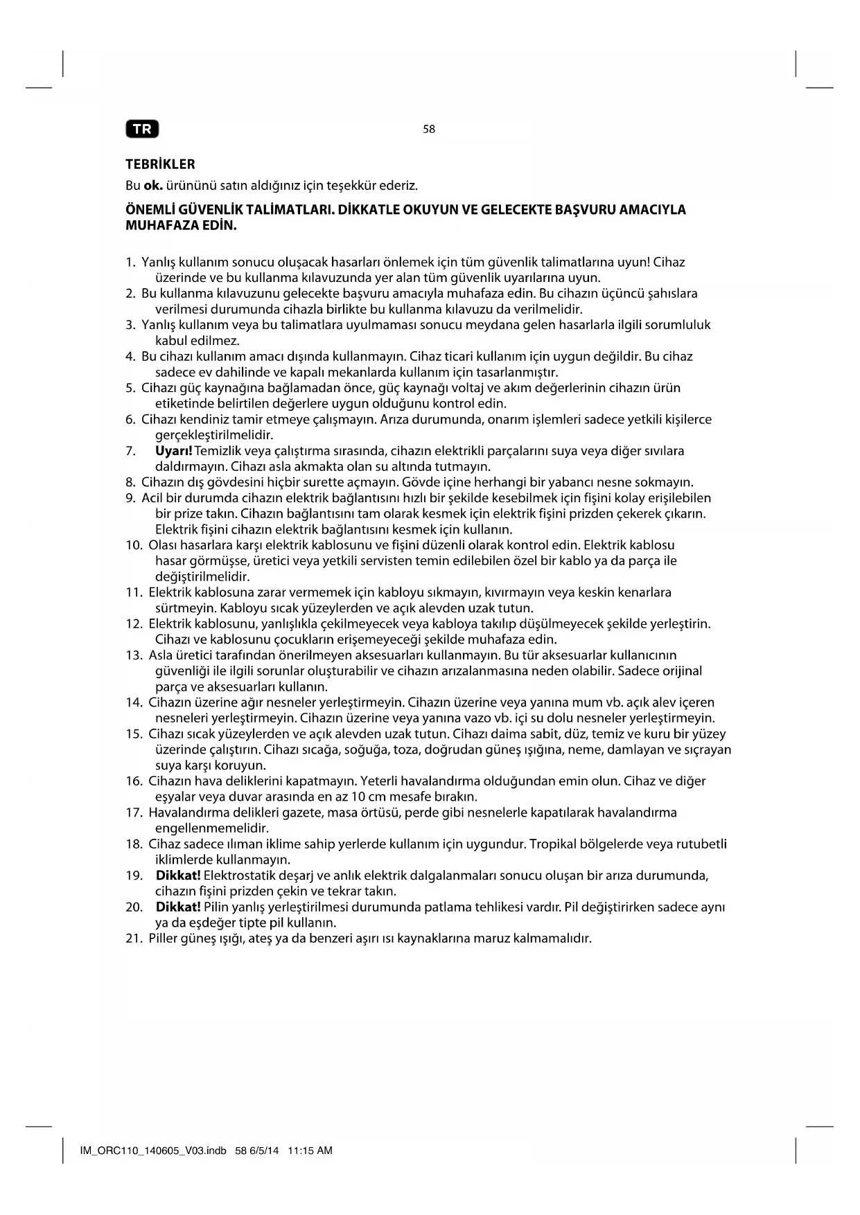 TEBRİKLER Bu ok. ürününü satın aldığınız için teşekkür ederiz. ÖNEMLİ GÜVENLİK TALİMATLARI. DİKKATLE OKUYUN VE GELECEKTE BAŞVURU AMACIYLA MUHAFAZA EDİN.