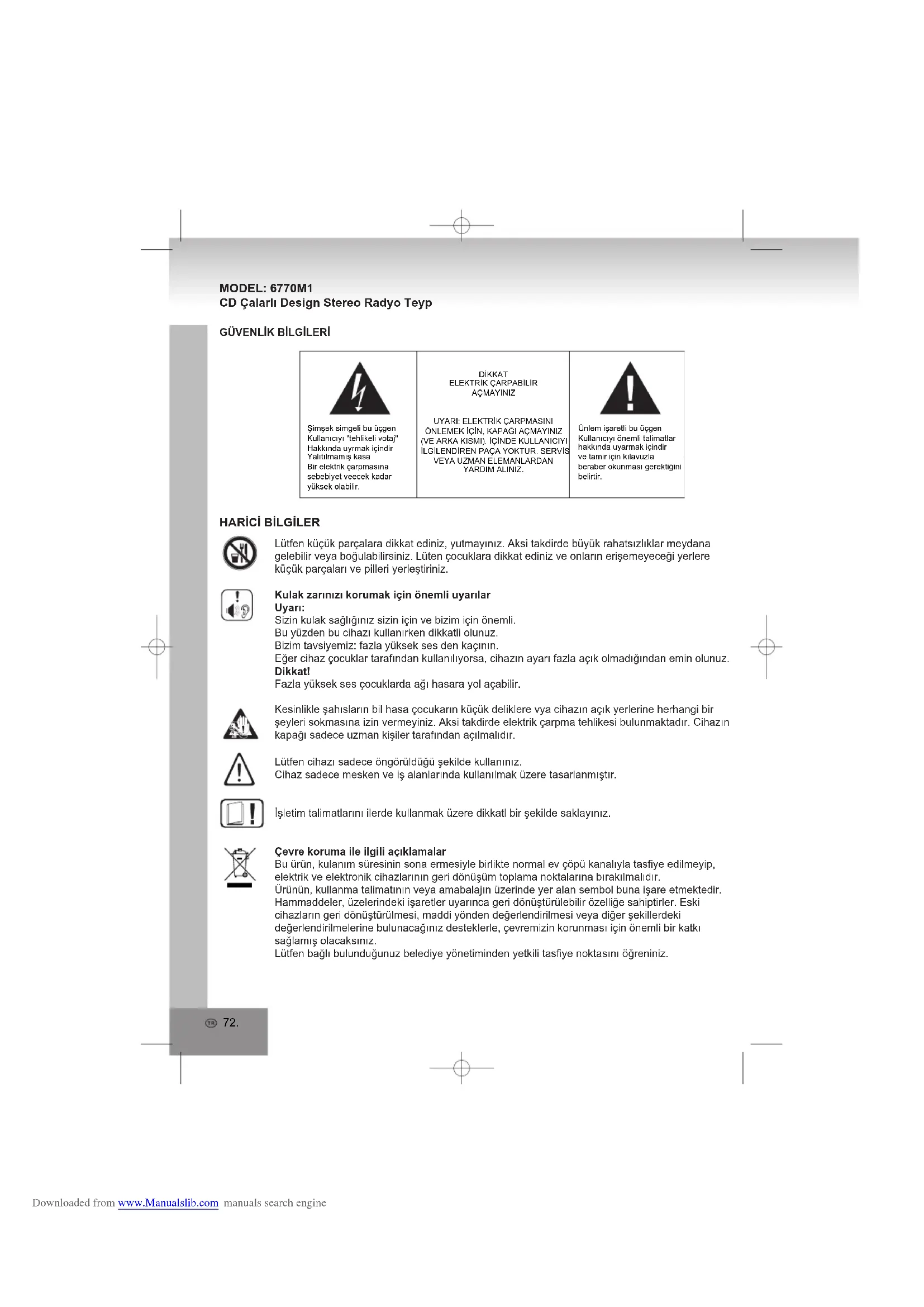 MODEL: 6770M1 CD Çalarlı Design Stereo Radyo Teyp GÜVENLİK BİLGİLERİDİKKATELEKTRİK ÇARPABİLİRAÇMAYINIZUYARI: ELEKTRİK ÇARPMASINI ÖNLEMEK İÇİN, KAPAĞI AÇMAYINIZ (VE ARKA KISMI). İÇİNDE KULLANICIYI İLGİLENDİREN PAÇA YOKTUR. SERVİS VEYA UZMAN ELEMANLARDAN YARDIM ALINIZ.Ünlem işaretli bu üçgenKullanıcıyı önemli talimatlar hakkında uyarmak içindirve tamir için kılavuzla beraber okunması gerektiğini belirtir.Şimşek simgeli bu üçgenKullanıcıyı "tehlikeli votaj" Hakkında uyrmak içindirYalıtılmamış kasa Bir elektrik çarpmasına sebebiyet veecek kadar yüksek olabilir.Lütfen küçük parçalara dikkat ediniz, yutmayınız. Aksi takdirde büyük rahatsızlıklar meydana gelebilir veya boğulabilirsiniz. Lüten çocuklara dikkat ediniz ve onların erişemeyeceği yerlere küçük parçaları ve pilleri yerleştiriniz.Kulak zarınızı korumak için önemli uyarılarUyarı:Sizin kulak sağlığınız sizin için ve bizim için önemli.Bu yüzden bu cihazı kullanırken dikkatli olunuz.Bizim tavsiyemiz: fazla yüksek ses den kaçının.Eğer cihaz çocuklar tarafından kullanılıyorsa, cihazın ayarı fazla açık olmadığından emin olunuz.Dikkat!Fazla yüksek ses çocuklarda ağı hasara yol açabilir.Kesinlikle şahısların bil hasa çocukarın küçük deliklere vya cihazın açık yerlerine herhangi bir şeyleri sokmasına izin vermeyiniz. Aksi takdirde elektrik çarpma tehlikesi bulunmaktadır. Cihazın kapağı sadece uzman kişiler tarafından açılmalıdır.Lütfen cihazı sadece öngörüldüğü şekilde kullanınız.Cihaz sadece mesken ve iş alanlarında kullanılmak üzere tasarlanmıştır.İşletim talimatlarını ilerde kullanmak üzere dikkatl bir şekilde saklayınız.Çevre koruma ile ilgili açıklamalarBu ürün, kulanım süresinin sona ermesiyle birlikte normal ev çöpü kanalıyla tasfiye edilmeyip, elektrik ve elektronik cihazlarının geri dönüşüm toplama noktalarına bırakılmalıdır.Ürünün, kullanma talimatının veya amabalajın üzerinde yer alan sembol buna işare etmektedir.Hammaddeler, üzelerindeki işaretler uyarınca geri dönüştürülebilir özelliğe sahiptirler. Eski cihazların geri dönüştürülmesi, maddi yönden değerlendirilmesi veya diğer şekillerdeki değerlendirilmelerine bulunacağınız desteklerle, çevremizin korunması için önemli bir katkı sağlamış olacaksınız.Lütfen bağlı bulunduğunuz belediye yönetiminden yetkili tasfiye noktasını öğreniniz. Downloaded from www.Manualslib.com manuals search engine73. GÜÇ KAYNAKLARI Pil haznesine 6 x R14/UM-2 boyutunda pil yerleştirin AC GÜÇ