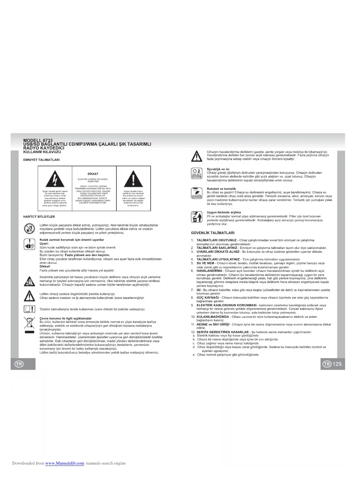 KENNISGEVING. Downloaded from www.Manualslib.com manuals search engine129. 128. Üçgen içindeki gerilim işareti bir uyarı sembolü olup kullanıcıya cihazın icinde izole edilmemiş tehlikeli gerilimin olduğunu ve bu gerilimin elektrik çarpacak kadar güçlü olduğu gösterir.Üçgen içindeki ünlem işareti bir uyarı sembolü olup kullanıcıya önemli bakım ve kullanım bilgileri vermektedir. Bu bilgileri kullanma kılavuzunda bulabilirsiniz.DİKKATELEKTRİK ÇARPMA TEHLİKESİ, AÇMAYINIZ.DİKKAT: ELEKTRİK ÇARPMA RİSKİNDEN KAÇINMAK İÇİN ÖN VEYA ARKA KAPAĞI AÇMAYINIZ. CİHAZIN İÇİNDE KULLANICININ TAMİR EDEBİLECEĞİ PARÇALAR BULUNMAMAKTADIR. SADECE UZMAN KİŞİLER TARAFINDAN TAMİR EDİLMESİ GEREKMEKTEDİR. MODELL 6733 USB/SD BAĞLANTILI CD/MP3/WMA ÇALARLI ŞIK TASARIMLI RADYO KAYDEDICI Ýþletim talimatlarýný ileride kullanmak üzere dikkatli bir þekilde saklayýnýz.Çevre koruma ile ilgili açýklamalarBu ürün, kullaným tarihinin sona ermesiyle birlikte normal ev çöpü kanalýyla tasfiye edilmeyip, elektrik ve elektronik cihazlarýnýn geri dönüþüm toplama noktalarýna býrakýlmalýdýr.Ürünün, kullanma talimatýnýn veya ambalajýn üzerinde yer alan sembol buna iþaret etmektedir. Hammaddeler, üzerlerindeki iþaretler uyarýnca geri dönüþtürülebilir özelliðe sahiptirler. Eski cihazlarýn geri dönüþtürülmesi, maddi yönden deðerlendirilmesi veya diðer þekillerdeki deðerlendirilmelerine bulunacaðýnýz desteklerle, çevremizin korunmasý için önemli bir katký saðlamýþ olacaksýnýz.Lütfen baðlý bulunduðunuz belediye yönetiminden yetkili tasfiye noktasýný öðreniniz.Kesinlikle þahýslarýn bil hassa çocuklarýn küçük deliklere veya cihazýn acýk yerlerine herhangi bir þeyleri sokmasýna izin vermeziniz. Aksi takdirde elektrik çarpma tehlikesi bulunmaktadýr. Cihazýn kapaðý sadece uzman kiþiler tarafýndan açýlmalýdýr.Lütfen küçük parçalara dikkat ediniz, yutmayýnýz. Aksi takdirde büyük rahatsýzlýklar meydana gelebilir veya boðulabilirsiniz. Lütfen çocuklara dikkat ediniz ve onlarýn eriþemeyeceði yerlere küçük parçalarý ve pilleri yerleþtiriniz.Kulak zarinizi korumak için önemli uyarilarUyari:Sizin kulak saðliðýnýz sizin için ve bizim içinde önemli.Bu yüzden bu cihazi kullanirken dikkatli olunuz.Bizim tavsiyemiz: Fazla yüksek ses den kaçinin.Eðer cihaz çocuklar tarafindan kullaniliyorsa, cihazin ses ayari fazla acik olmadiðýndan emin olunuz.Dikkat!Fazla yüksek ses çocuklarda aðýr hasara yol açabilir.Lütfen cihazý sadece öngörüldüðü þekilde kullanýnýz.Cihaz sadece mesken ve iþ alanlarýnda kullanýlmak üzere tasarlanmýþtýr.KULLANIM KILAVUZUEMNIYET TALIMATLARIHARÝCÝ BÝLGÝLERGÜVENLİK TALİMATLARI