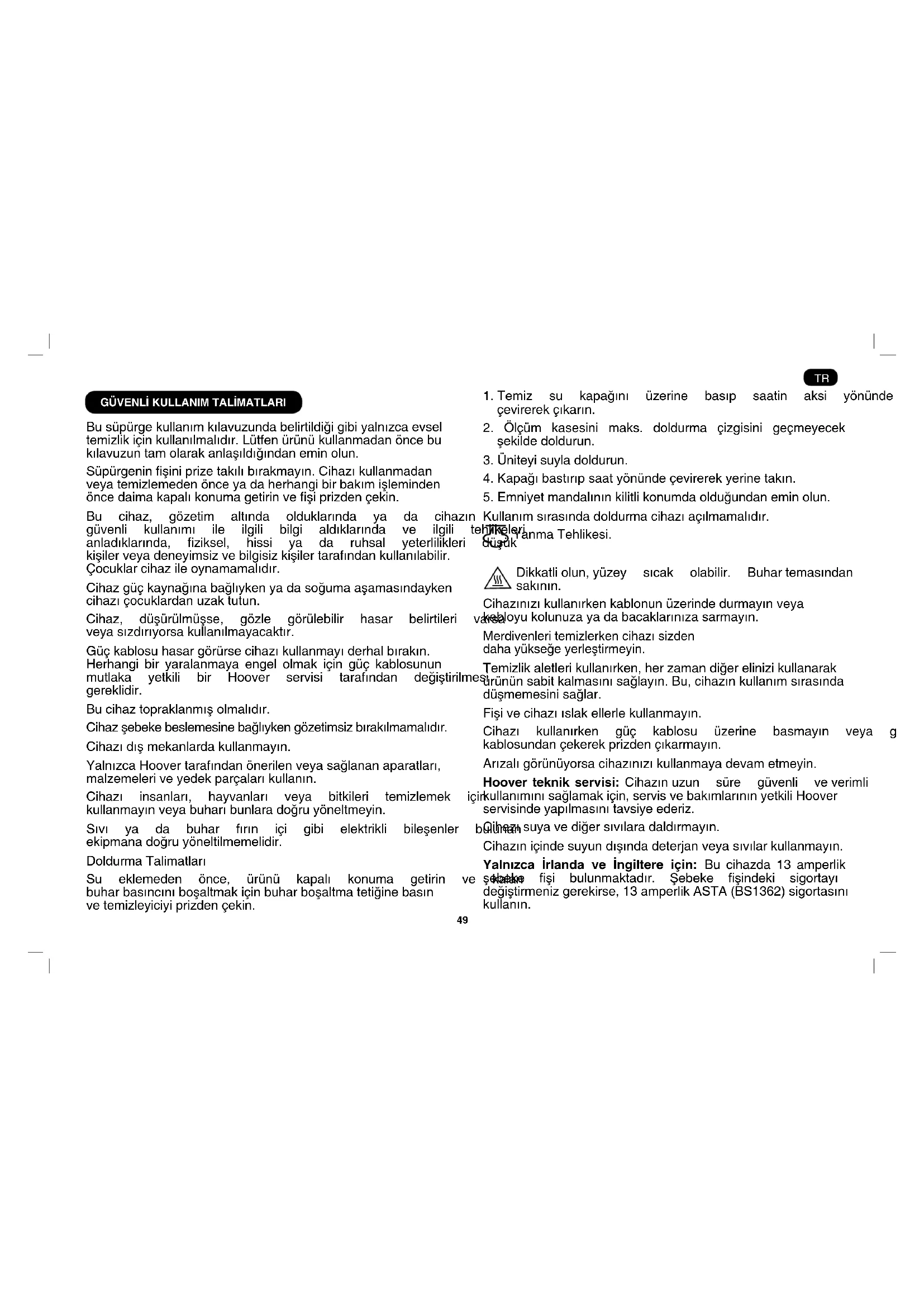 Busüpürgekullanımkılavuzundabelirtildiğigibiyalnızcaevsel temizlikiçinkullanılmalıdır.Lütfenürünükullanmadanöncebu kılavuzuntamolarakanlaşıldığındaneminolun. Süpürgeninşiniprizetakılıbırakmayın.Cihazıkullanmadan veyatemizlemedenönceyadaherhangibirbakımişleminden öncedaimakapalıkonumagetirinveşiprizdençekin. Bu cihaz, gözetim altında olduklarında ya da cihazın güvenli kullanımı ile ilgili bilgi aldıklarında ve ilgili tehlikeleri anladıklarında, ziksel, hissi ya da ruhsal yeterlilikleri düşük kişilerveyadeneyimsizvebilgisizkişilertarafındankullanılabilir. Çocuklarcihazileoynamamalıdır. Cihazgüçkaynağınabağlıykenyadasoğumaaşamasındayken cihazıçocuklardanuzaktutun. Cihaz, düşürülmüşse, gözle görülebilir hasar belirtileri varsa veyasızdırıyorsakullanılmayacaktır. Güçkablosuhasargörürsecihazıkullanmayıderhalbırakın. Herhangi bir yaralanmaya engel olmak için güç kablosunun mutlaka yetkili bir Hoover servisi tarafından değiştirilmesi gereklidir. Bucihaztopraklanmışolmalıdır. Cihazşebekebeslemesinebağlıykengözetimsizbırakılmamalıdır. Cihazıdışmekanlardakullanmayın. YalnızcaHoovertarafındanönerilenveyasağlananaparatları, malzemeleriveyedekparçalarıkullanın. Cihazı insanları, hayvanları veya bitkileri temizlemek için kullanmayınveyabuharıbunlaradoğruyöneltmeyin. Sıvı ya da buhar fırın içi gibi elektrikli bileşenler bulunan ekipmanadoğruyöneltilmemelidir. DoldurmaTalimatları Su eklemeden önce, ürünü kapalı konuma getirin ve kalan buharbasıncınıboşaltmakiçinbuharboşaltmatetiğinebasın ve temizleyiciyi prizden çekin. 1.Temiz su kapağını üzerine basıp saatin aksi yönünde çevirerekçıkarın.