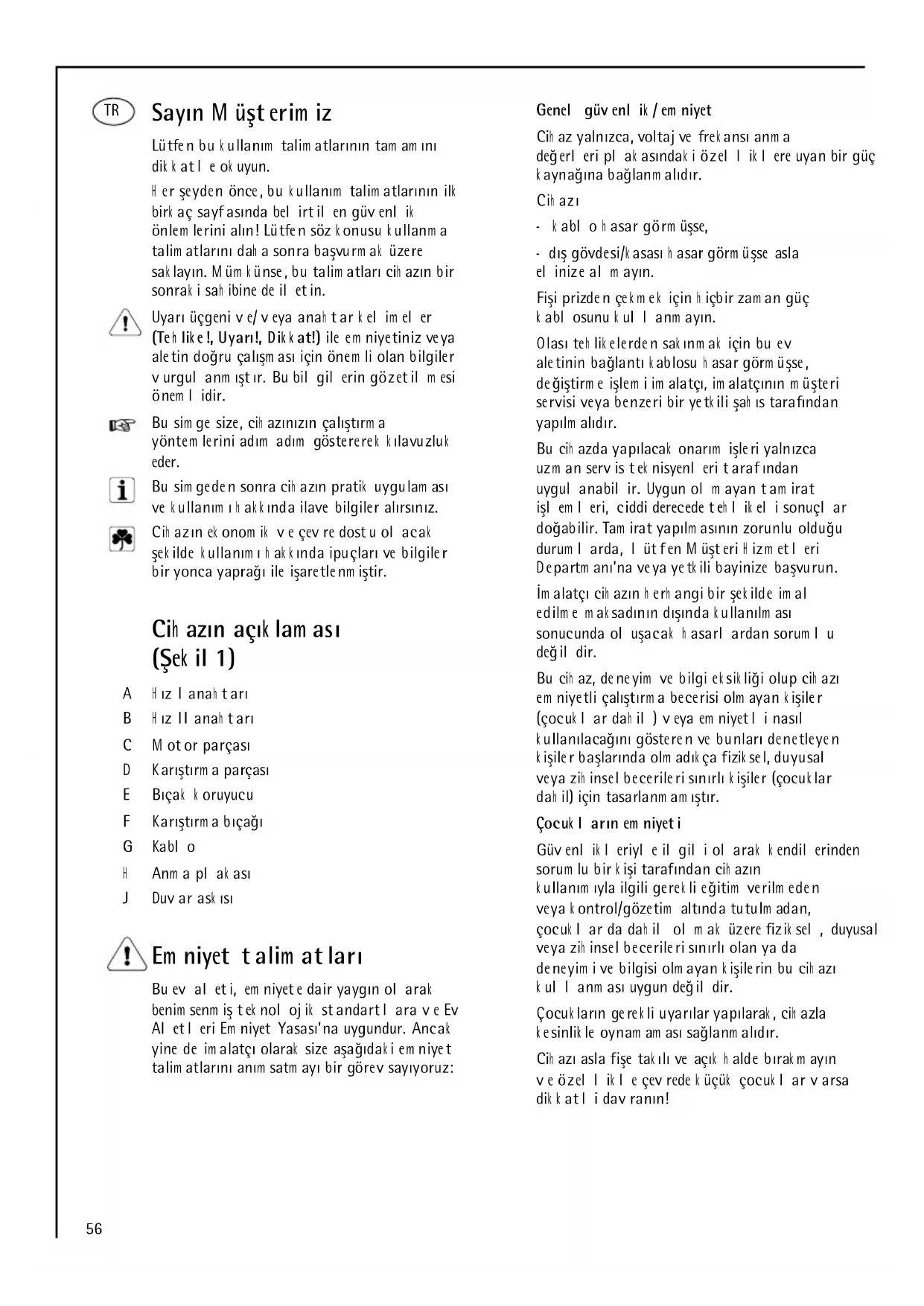 - sm ernicu EM C 89 /336/EEC s dodatk am i 9 2/31/EEC a 9 3/68/EEC.56 Sayın M üşterim iz Lütfen bu k ullanım talim atlarının tam am ını dik k atle ok uyun. H er şeyden önce, bu k ullanım talim atlarının ilk birk aç sayfasında belirtilen güvenlik önlem lerini alın! Lütfen söz k onusu k ullanm a talim atlarını dah a sonra başvurm ak üzere sak layın. M üm k ünse, bu talim atları cih azın bir sonrak i sah ibine de iletin. Uyarı üçgeni ve/veya anah tar k elim eler (Teh lik e!, Uyarı!, Dik k at!) ile em niyetiniz veya aletin doğru çalışm ası için önem li olan bilgiler vurgulanm ıştır. Bu bilgilerin gözetilm esi önem lidir. Bu sim ge size, cih azınızın çalıştırm a yöntem lerini adım adım göstererek k ılavuzluk eder. Bu sim geden sonra cih azın pratik uygulam ası ve k ullanım ı h ak k ında ilave bilgiler alırsınız. Cih azın ek onom ik ve çevre dostu olacak şek ilde k ullanım ı h ak k ında ipuçları ve bilgiler bir yonca yaprağı ile işaretlenm iştir. Cih azın açık lam ası (Şek il 1) A H ız I anah tarı B H ız II anah tarı C M otor parçası D Karıştırm a parçası E Bıçak k oruyucu F Karıştırm a bıçağı G Kablo H Anm a plak ası J Duvar ask ısı Em niyet talim atları Bu ev aleti, em niyete dair yaygın olarak benim senm iş tek nolojik standartlara ve Ev Aletleri Em niyet Yasası'na uygundur. Ancak yine de im alatçı olarak size aşağıdak i em niyet talim atlarını anım satm ayı bir görev sayıyoruz: Genel güvenlik /em niyet