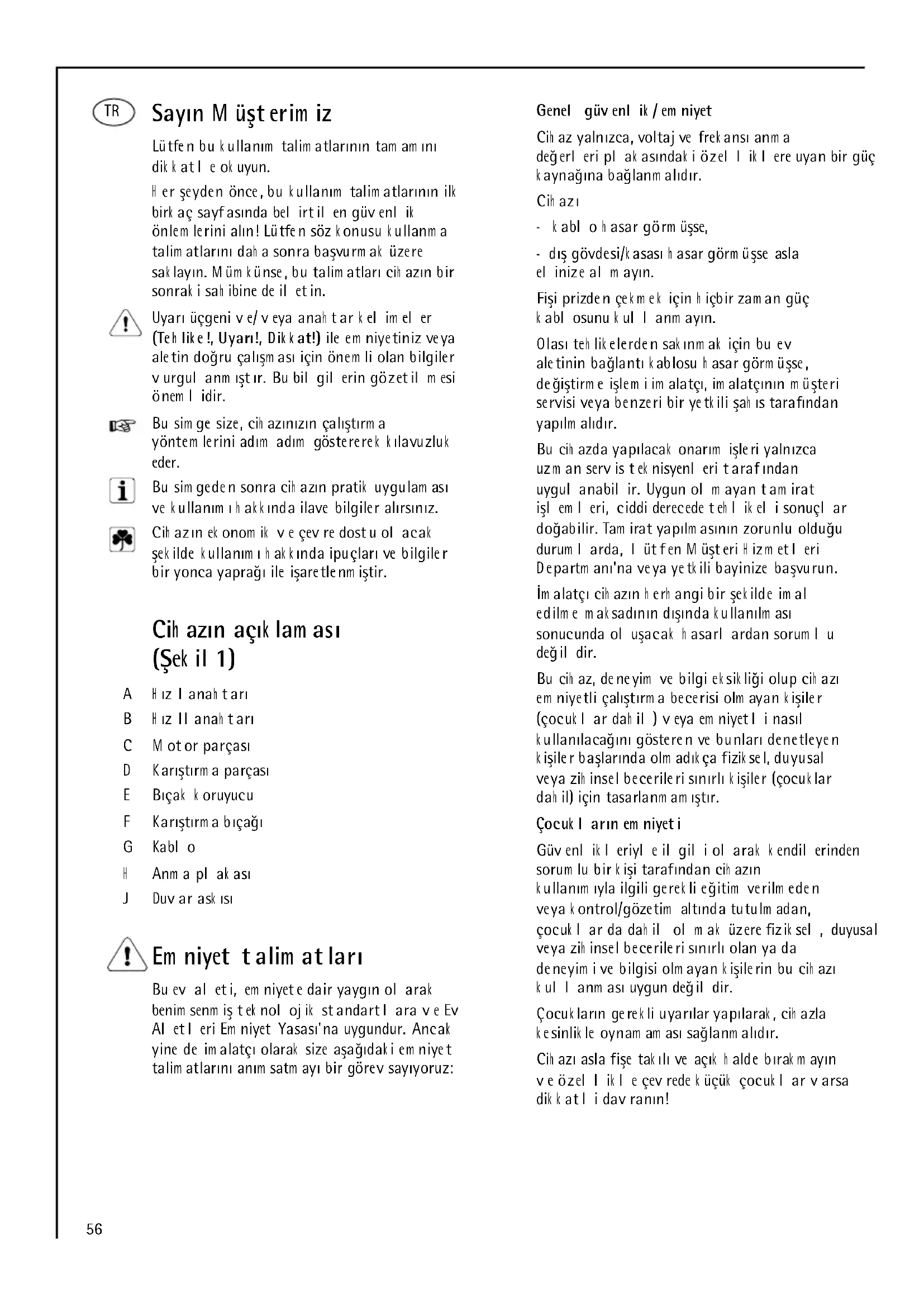 - Cih azı asla fişe tak ılı ve açık h alde bırak m ayın ve özellik le çevrede k üçük çocuk lar varsa dik k atli davranın! TR57 Ev aletinizi k ullanırk en