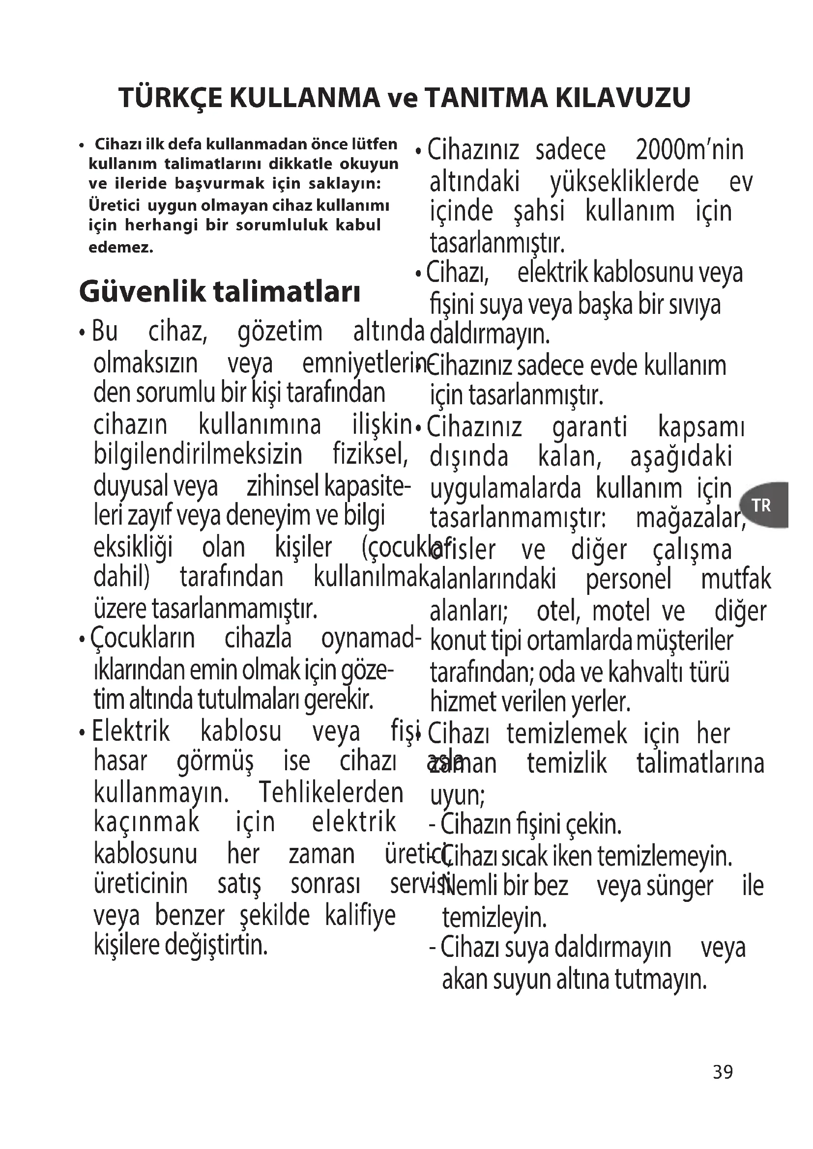 - Cihazı temizlemek için her zaman temizlik talimatlarına uyun; -Cihazınşiniçekin. -Cihazısıcakikentemizlemeyin. -Nemlibirbez veyasünger ile temizleyin. -Cihazısuyadaldırmayın veya akansuyunaltınatutmayın. TÜRKÇE KULLANMA ve TANITMA KILAVUZU TR40