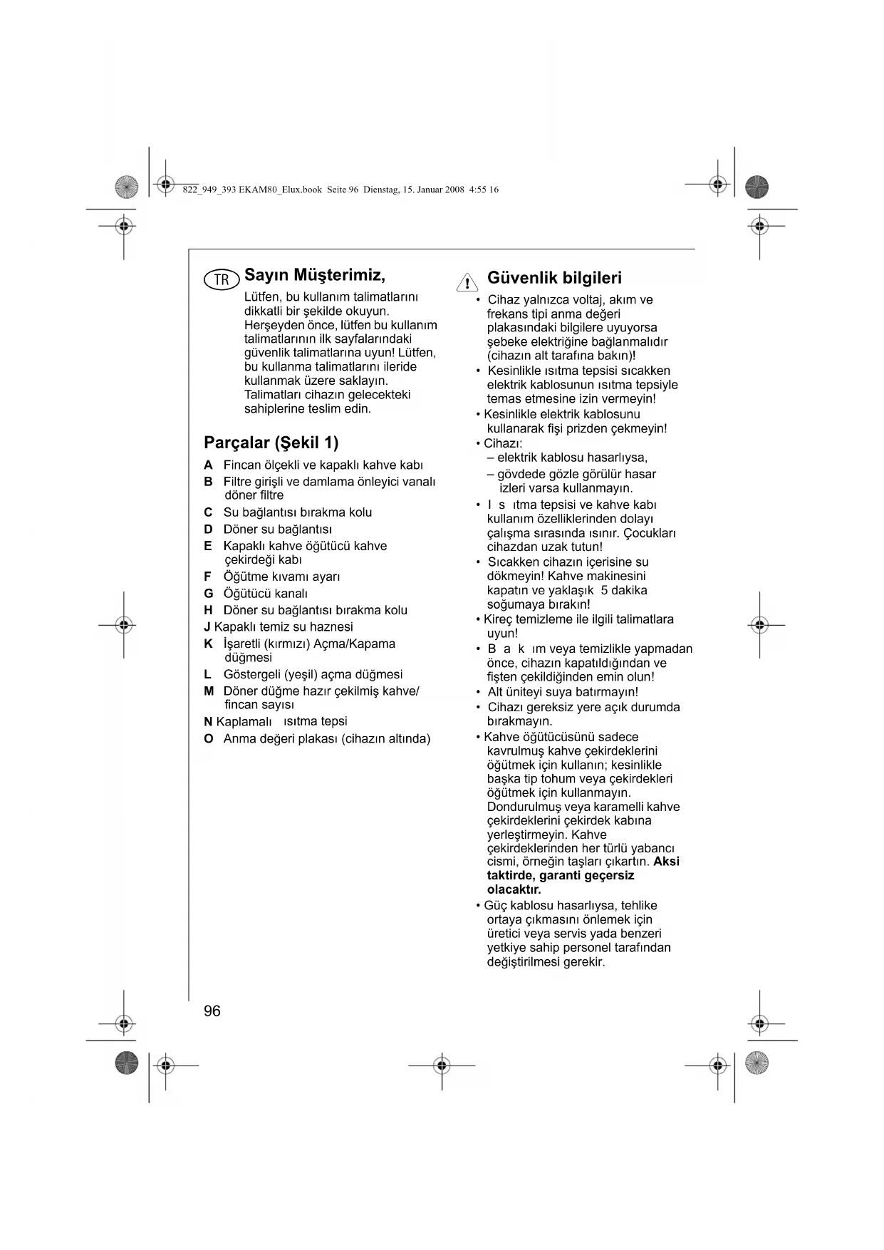 - Güç kablosu hasarlıysa, tehlike ortaya çıkmasını önlemek için üretici veya servis yada benzeri yetkiye sahip personel tarafından değiştirilmesi gerekir. 822_949_393 EKAM80_Elux.book Seite 96 Dienstag, 15. Januar 2008 4:55 16t