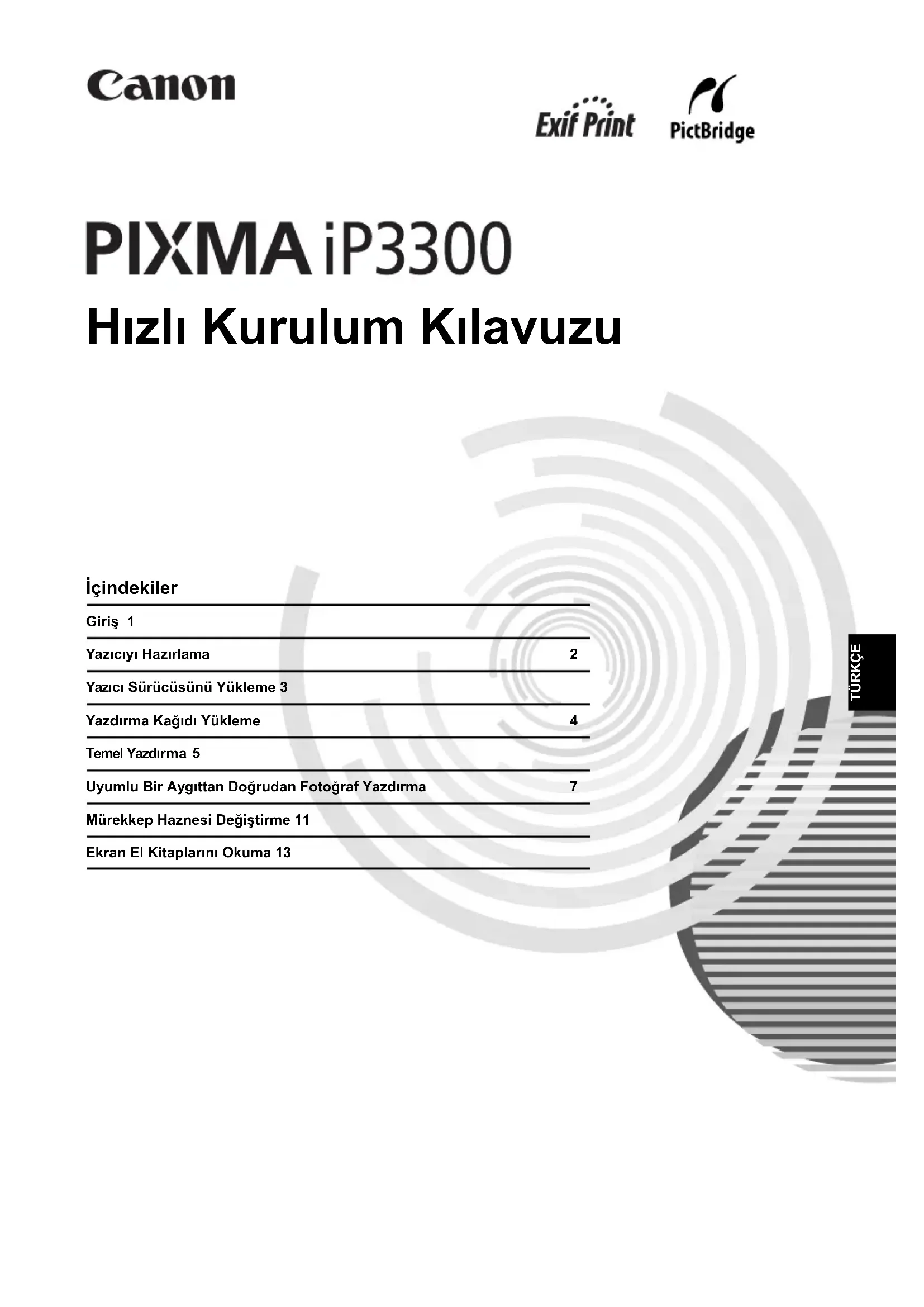 (EHP: Nórsko, Island a Lichtenštajnsko) Len pre zákazníkov v Európe, na Strednom východe, v Afrike a v Rusku Kontakty na podporu zákazníkom spoločnosti Canon nájdete na poslednej strane brožúrky Európske záručné systémy (European Warranty Systems, EWS) alebo na adrese www.canon-europe.com. Canon Europa N.V., Bovenkerkerweg 59-61, 1185 XB Amstelveen, HolandskoTÜRKÇE Hızlı Kurulum Kılavuzu İçindekiler Giriş 1 Yazıcıyı Hazırlama 2 Yazıcı Sürücüsünü Yükleme 3 Yazdırma Kağıdı Yükleme 4 Temel Yazdırma 5 Uyumlu Bir Aygıttan Doğrudan Fotoğraf Yazdırma 7 Mürekkep Haznesi Değiştirme 11 Ekran El Kitaplarını Okuma 13TÜRKÇE Exif Print Bu yazıcı Exif Print standardını destekler. Exif Print, dijital kameralar ve yazıcılar arasındaki iletişimi geliştirmek için kullanılan bir standarttır. Exif Print uyumlu bir dijital fotoğraf makinesine bağlanarak, makinenin çekim anındaki resim verileri kullanılıp en iyi duruma getirilir ve böylece çok yüksek kalitede baskılar elde edilir. Canadian Radio Interference Regulations Bu dijital cihaz, Industry Canada’nın ICES-003 bölümündeki “Dijital Cihaz” başlıklı, enterferansa neden olan aygıt standardında beyan edildiği gibi, dijital bir aygıttan yayılan radyo gürültüleri için belirlenen B Sınıfı sınırlarını aşmaz. Cet appareil numérique respecte les limites de bruits radioélectriques applicables aux appareils numériques de Classe B prescrites dans la norme sur le matériel brouilleur NMB- 003 d'Industrie Canada intitulée « Appareils numériques ». Uluslararası ENERGY STAR