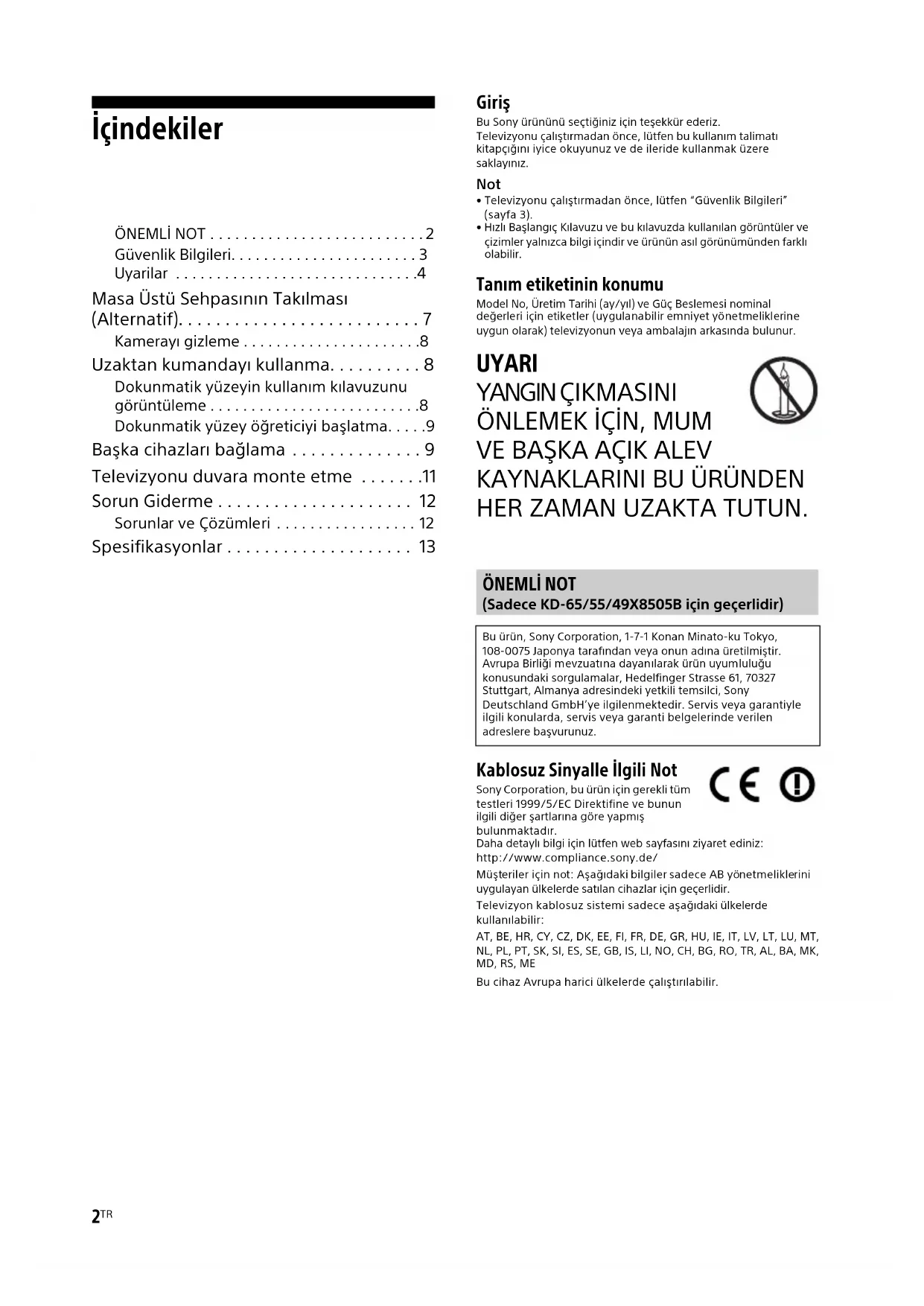 HER ZAMAN UZAKTA TUTUN. Kablosuz Sinyalle İlgili Not Sony Corporation, bu ürün için gerekli tüm testleri 1999/5/EC Direktifine ve bunun ilgili diğer şartlarına göre yapmış bulunmaktadır.Daha detaylı bilgi için lütfen web sayfasını ziyaret ediniz:http://www.compliance.sony.de/ Müşteriler için not: Aşağıdaki bilgiler sadece AB yönetmeliklerini uygulayan ülkelerde satılan cihazlar için geçerlidir.Televizyon kablosuz sistemi sadece aşağıdaki ülkelerde kullanılabilir:AT, BE, HR, CY, CZ, DK, EE, FI, FR, DE, GR, HU, IE, IT, LV, LT, LU, MT, NL, PL, PT, SK, SI, ES, SE, GB, IS, LI, NO, CH, BG, RO, TR, AL, BA, MK, MD, RS, MEBu cihaz Avrupa harici ülkelerde çalıştırılabilir. ÖNEMLİ NOT (Sadece KD-65/55/49X8505B için geçerlidir)Bu ürün, Sony Corporation, 1-7-1 Konan Minato-ku Tokyo, 108-0075 Japonya tarafından veya onun adına üretilmiştir. Avrupa Birliği mevzuatına dayanılarak ürün uyumluluğu konusundaki sorgulamalar, Hedelfinger Strasse 61, 70327 Stuttgart, Almanya adresindeki yetkili temsilci, Sony Deutschland GmbH’ye ilgilenmektedir. Servis veya garantiyle ilgili konularda, servis veya garanti belgelerinde verilen adreslere başvurunuz.GB