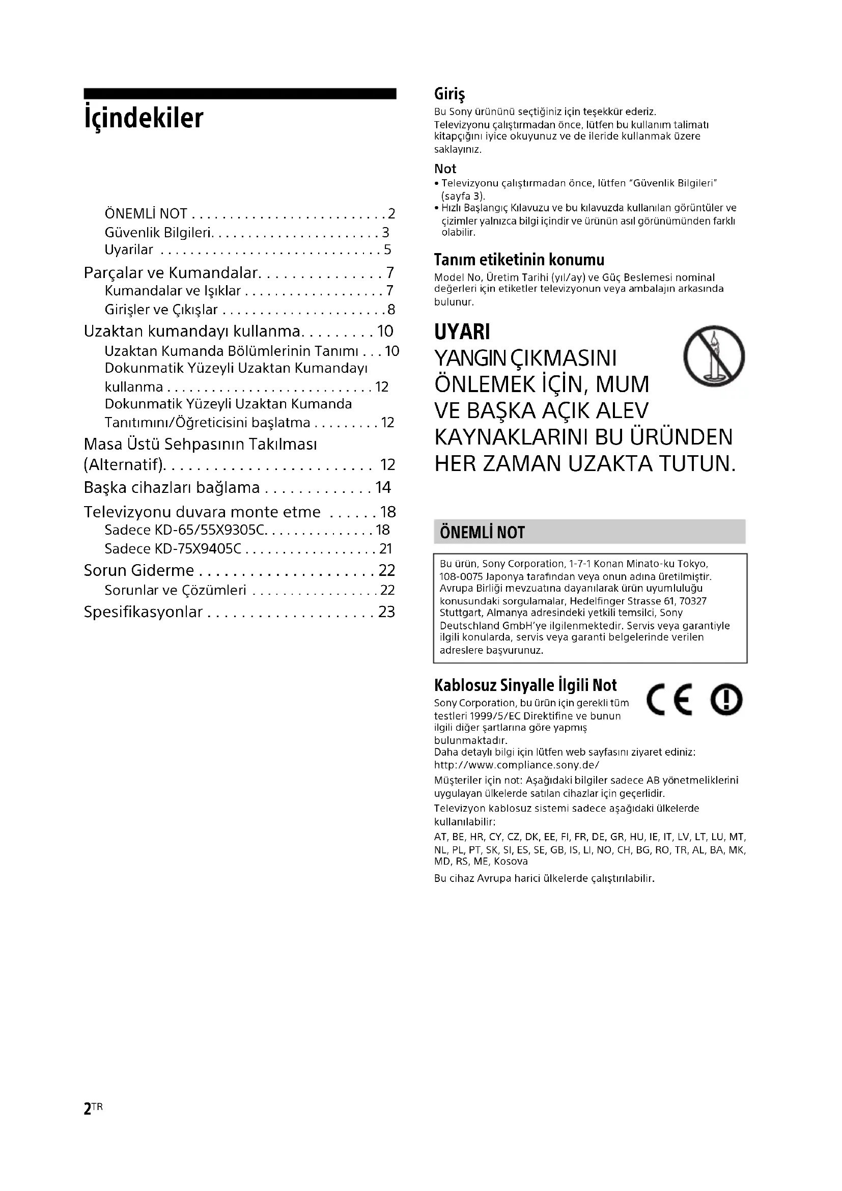 - Spesifikasyonlar Giriş Bu Sony ürününü seçtiğiniz için teşekkür ederiz. Televizyonu çalıştırmadan önce, lütfen bu kullanım talimatı kitapçığını iyice okuyunuz ve de ileride kullanmak üzere saklayınız. Not p. 23