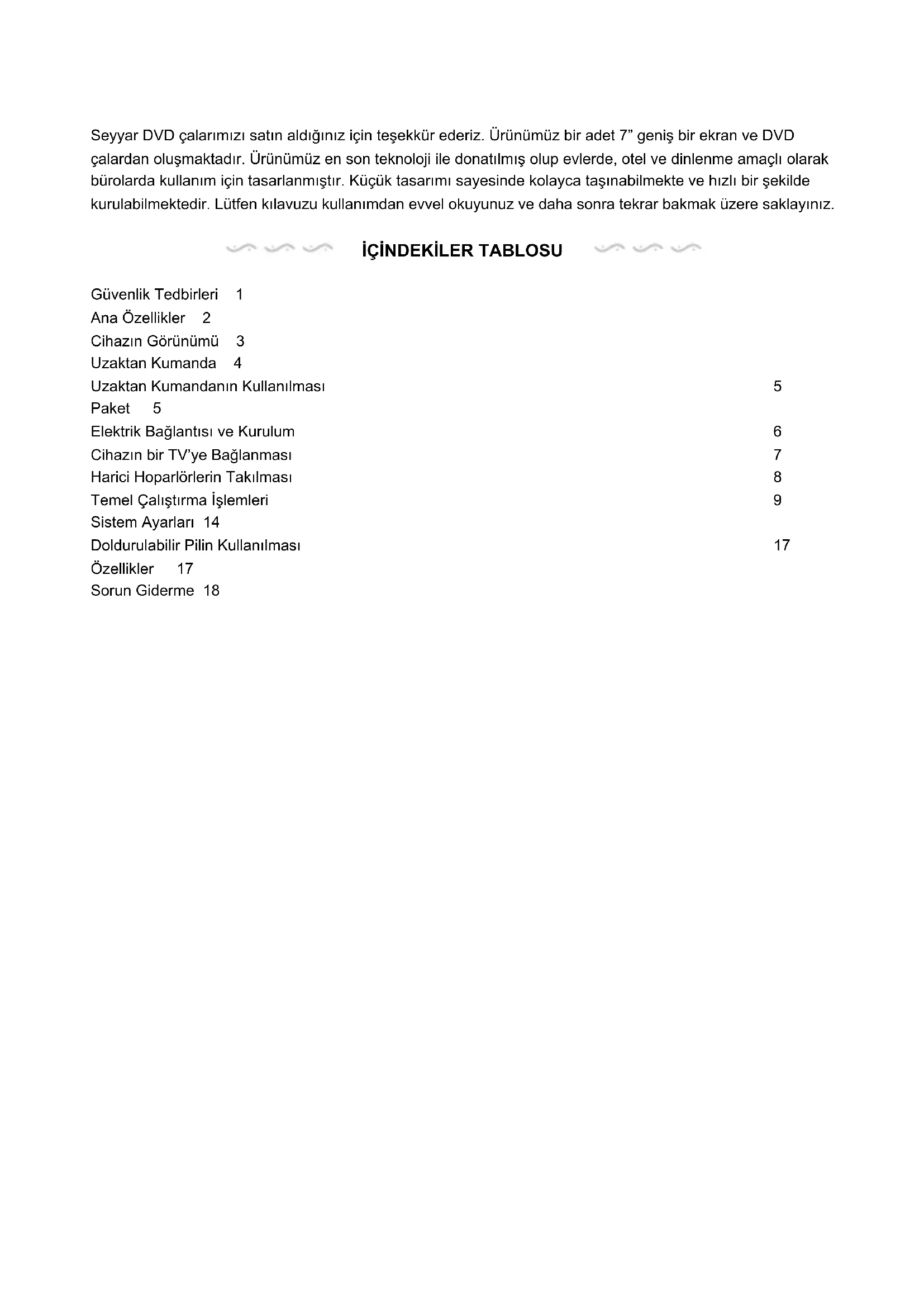 Seyyar DVD calarimizi satin aldiginiz icin teşekkür ederiz. Ürünümüz bir adet 7" genis bir ekran ve DVD calardan olusmaktadir. Ürünümuz en son teknojı ile donatilmı olup evlerde, otel ve dinlenme amaçlı olarak bürolarda kullanım icin tasarlanmistir. Küçuk tasarimi sayesinde kolayca taşınabilmekte ve%Hizlbir sekilde kurulabilmektedir. Lüften kilavuzu kullanımdan evvel okuyunuz ve daha sonra tekrar bakmak üzere saklayiniz.