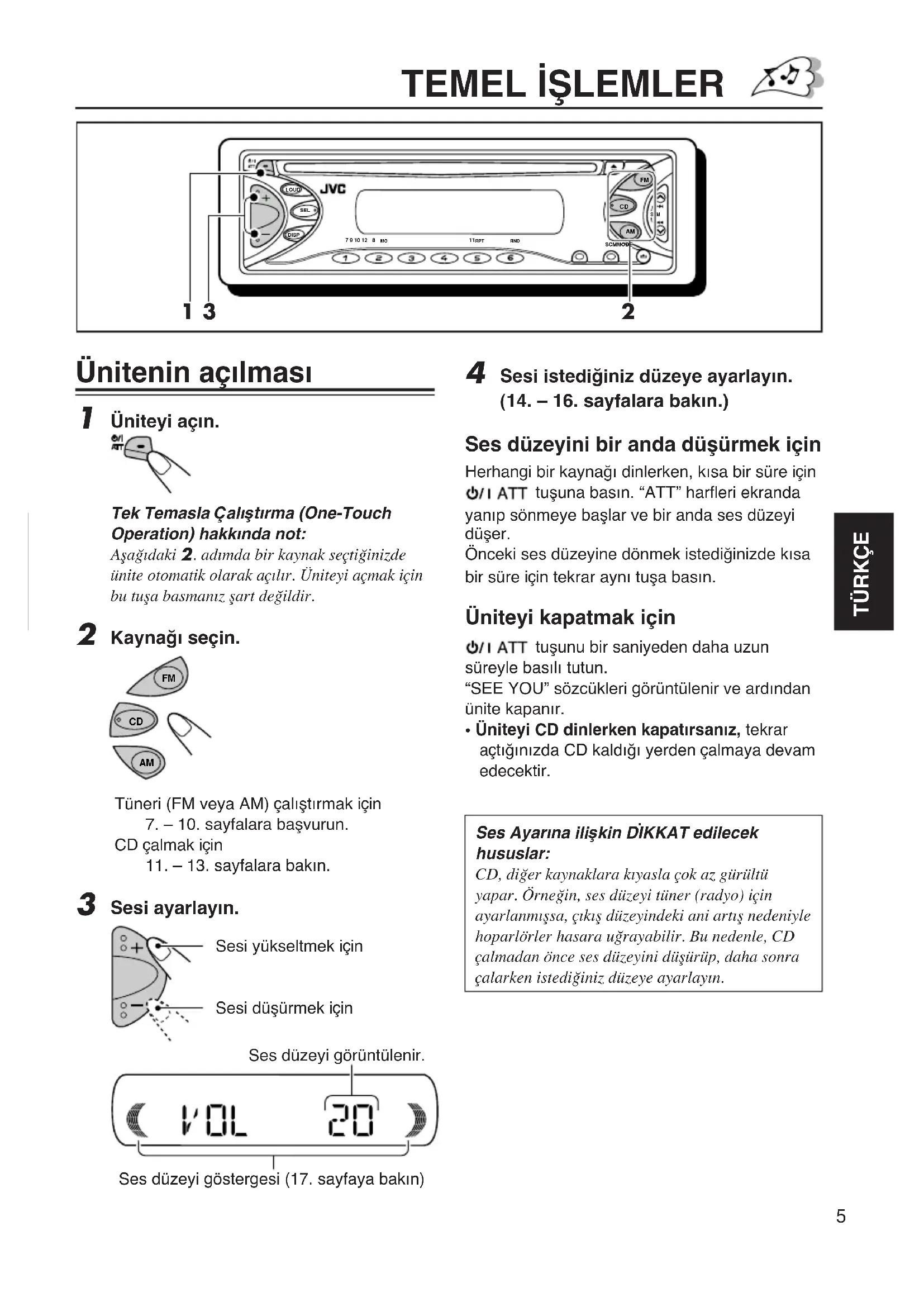 Sesi istedi∂iniz düzeye ayarlayΩn. (14. – 16. sayfalara bakΩn.) Ses düzeyini bir anda düπürmek için Herhangi bir kayna∂Ω dinlerken, kΩsa bir süre için tuπuna basΩn. “ATT” harfleri ekrandayanΩp sönmeye baπlar ve bir anda ses düzeyidüπer.Önceki ses düzeyine dönmek istedi∂inizde kΩsabir süre için tekrar aynΩ tuπa basΩn. Üniteyi kapatmak için tuπunu bir saniyeden daha uzunsüreyle basΩlΩ tutun.“SEE YOU” sözcükleri görüntülenir ve ardΩndanünite kapanΩr.• Üniteyi CD dinlerken kapatΩrsanΩz, tekraraçtΩ∂ΩnΩzda CD kaldΩ∂Ω yerden çalmaya devamedecektir.Ses AyarΩna iliπkin D∑KKAT edilecekhususlar:CD, di∂er kaynaklara kΩyasla çok az gürültüyapar. Örne∂in, ses düzeyi tüner (radyo) içinayarlanmΩπsa, çΩkΩπ düzeyindeki ani artΩπ nedeniylehoparlörler hasara u∂rayabilir. Bu nedenle, CDçalmadan önce ses düzeyini düπürüp, daha sonraçalarken istedi∂iniz düzeye ayarlayΩn.Sesi yükseltmek içinSesi düπürmek için