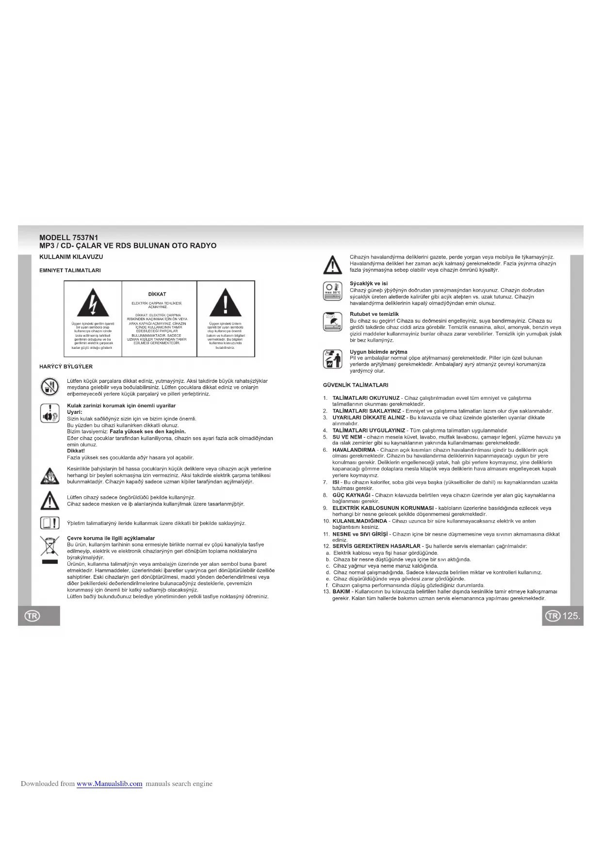 Frequentiebereik: 522kHz -1.620kHz Gevoeligheid 40dB IF-frequentie 450kHz CD-SPELER Systeem Compact disk audiosysteem Disk-formaten die gebruikt kunnen worden: CD / CD-R / CD-RW / MP3 Signaalformaat Sampling frequentie 44.1kHz Frequentie eigenschappen 20-100Hz ≤ 5dB 10-20kHz ≤ 5dB Geluids- / lawaairatio CD 50dB bij 1kHz Kanalen 2 (STEREO). Afmetingen ongeveer 178 x 50 x 188 mm Gewicht ongeveer 1,6 kg HET APPARAAT IS ONDERHEVIG AAN VERANDERINGEN ZONDER VOORAFGAANDE MEDEDELING. Downloaded from www.Manualslib.com manuals search engine125. 124. Üçgen içindeki gerilim işareti bir uyarı sembolü olup kullanıcıya cihazın icinde izole edilmemiş tehlikeli gerilimin olduğunu ve bu gerilimin elektrik çarpacak kadar güçlü olduğu gösterir.Üçgen içindeki ünlem işareti bir uyarı sembolü olup kullanıcıya önemli bakım ve kullanım bilgileri vermektedir. Bu bilgileri kullanma kılavuzunda bulabilirsiniz.DİKKATELEKTRİK ÇARPMA TEHLİKESİ, AÇMAYINIZ.DİKKAT: ELEKTRİK ÇARPMA RİSKİNDEN KAÇINMAK İÇİN ÖN VEYA ARKA KAPAĞI AÇMAYINIZ. CİHAZIN İÇİNDE KULLANICININ TAMİR EDEBİLECEĞİ PARÇALAR BULUNMAMAKTADIR. SADECE UZMAN KİŞİLER TARAFINDAN TAMİR EDİLMESİ GEREKMEKTEDİR. MODELL 7537N1 MP3 / CD- ÇALAR VE RDS BULUNAN OTO RADYO Cihazýn havalandýrma deliklerini gazete, perde yorgan veya mobilya ile týkamayýnýz. Havalandýrma delikleri her zaman acýk kalmasý gerekmektedir. Fazla ýsýnma cihazýn fazla ýsýnmasýna sebep olabilir veya cihazýn ömrünü kýsaltýr.Ýþletim talimatlarýný ileride kullanmak üzere dikkatli bir þekilde saklayýnýz.Çevre koruma ile ilgili açýklamalarBu ürün, kullaným tarihinin sona ermesiyle birlikte normal ev çöpü kanalýyla tasfiye edilmeyip, elektrik ve elektronik cihazlarýnýn geri dönüþüm toplama noktalarýna býrakýlmalýdýr.Ürünün, kullanma talimatýnýn veya ambalajýn üzerinde yer alan sembol buna iþaret etmektedir. Hammaddeler, üzerlerindeki iþaretler uyarýnca geri dönüþtürülebilir özelliðe sahiptirler. Eski cihazlarýn geri dönüþtürülmesi, maddi yönden deðerlendirilmesi veya diðer þekillerdeki deðerlendirilmelerine bulunacaðýnýz desteklerle, çevremizin korunmasý için önemli bir katký saðlamýþ olacaksýnýz.Lütfen baðlý bulunduðunuz belediye yönetiminden yetkili tasfiye noktasýný öðreniniz.Sýcaklýk ve isiCihazý güneþ ýþýðýnýn doðrudan yansýmasýndan koruyunuz. Cihazýn doðrudan sýcaklýk üreten aletlerde kalirüfer gibi acýk ateþten vs. uzak tutunuz. Cihazýn havalandýrma deliklerinin kapalý olmadýðýndan emin olunuz.Rutubet ve temizlikBu cihaz su geçirir! Cihaza su deðmesini engelleyiniz, suya bandirmayiniz. Cihaza su girdiði takdirde cihaz ciddi ariza görebilir. Temizlik esnasina, alkol, amonyak, benzin veya çizici maddeler kullanmayiniz bunlar cihaza zarar verebilirler. Temizlik için yumuþak ýslak bir bez kullanýnýz.Kesinlikle þahýslarýn bil hassa çocuklarýn küçük deliklere veya cihazýn acýk yerlerine herhangi bir þeyleri sokmasýna izin vermeziniz. Aksi takdirde elektrik çarpma tehlikesi bulunmaktadýr. Cihazýn kapaðý sadece uzman kiþiler tarafýndan açýlmalýdýr.Lütfen küçük parçalara dikkat ediniz, yutmayýnýz. Aksi takdirde büyük rahatsýzlýklar meydana gelebilir veya boðulabilirsiniz. Lütfen çocuklara dikkat ediniz ve onlarýn eriþemeyeceði yerlere küçük parçalarý ve pilleri yerleþtiriniz.Kulak zarinizi korumak için önemli uyarilarUyari:Sizin kulak saðliðýnýz sizin için ve bizim içinde önemli.Bu yüzden bu cihazi kullanirken dikkatli olunuz.Bizim tavsiyemiz: Fazla yüksek ses den kaçinin.Eðer cihaz çocuklar tarafindan kullaniliyorsa, cihazin ses ayari fazla acik olmadiðýndan emin olunuz.Dikkat!Fazla yüksek ses çocuklarda aðýr hasara yol açabilir.Lütfen cihazý sadece öngörüldüðü þekilde kullanýnýz.Cihaz sadece mesken ve iþ alanlarýnda kullanýlmak üzere tasarlanmýþtýr.Uygun bicimde arýtmaPil ve ambalajlar normal çöpe atýlmamasý gerekmektedir. Piller için özel bulunan yerlerde arýtýlmasý gerekmektedir. Ambalajlarý ayrý atmanýz çevreyi korumanýza yardýmcý olur.HARÝCÝ BÝLGÝLERKULLANIM KILAVUZUEMNIYET TALIMATLARIGÜVENLİK TALİMATLARI
