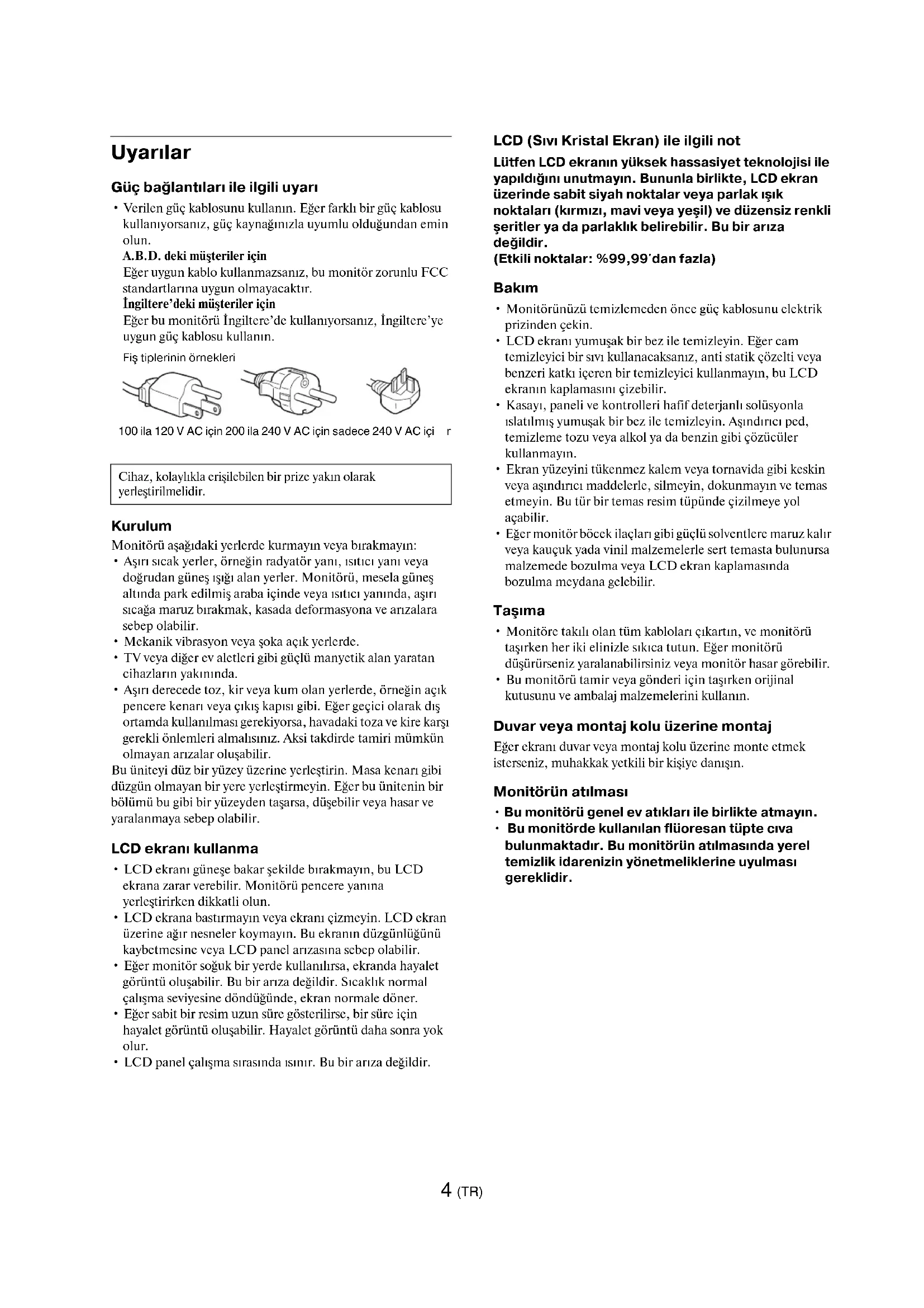 - Bu monitörde kullanılan flüoresan tüpte cıva bulunmaktadır. Bu monitörün atılmasında yerel temizlik idarenizin yönetmeliklerine uyulması gereklidir. Cihaz, kolaylıkla erişilebilen bir prize yakın olarak yerleştirilmelidir. Fiş tiplerinin örnekleri 100 ila 120 V AC için 200 ila 240 V AC için sadece 240 V AC içi