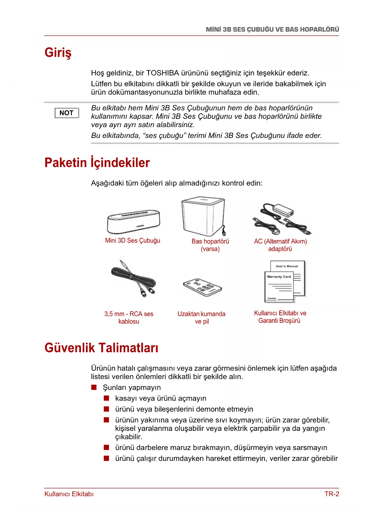 MİNİ 3B SES ÇUBUĞU VE BAS HOPARLÖRÜ Giriş Hoş geldiniz, bir TOSHIBA ürününü seçtiğiniz için teşekkür ederiz. Lütfen bu elkitabını dikkatli bir şekilde okuyun ve ileride bakabilmek için ürün dokümantasyonunuzla birlikte muhafaza edin. Paketin İçindekiler Aşağıdaki tüm öğeleri alıp almadığınızı kontrol edin: Güvenlik Talimatları Ürünün hatalı çalışmasını veya zarar görmesini önlemek için lütfen aşağıda listesi verilen önlemleri dikkatli bir şekilde alın. ■ Şunları yapmayın ■ kasayı veya ürünü açmayın ■ ürünü veya bileşenlerini demonte etmeyin ■ ürünün yakınına veya üzerine sıvı koymayın; ürün zarar görebilir, kişisel yaralanma oluşabilir veya elektrik çarpabilir ya da yangın çıkabilir. ■ ürünü darbelere maruz bırakmayı n, düşürmeyin veya sarsmayın ■ ürünü çalışır durumdayken hareket ettirmeyin, veriler zarar görebilir Bu elkitabı hem Mini 3B Ses Çubuğunun hem de bas hoparlörünün kullanımını kapsar. Mini 3B Ses Çubuğunu ve bas hoparlörünü birlikte veya ayrı ayrı satın alabilirsiniz. Bu elkitabında, “ses çubuğu” terimi Mini 3B Ses Çubuğunu ifade eder. NOT User’s Manual Mini 3D Ses Çubuğu Bas hoparlörü (varsa) AC (Alternatif Akım) adaptörü 3,5 mm - RCA ses kablosu Uzaktan kumanda ve pil Kullanıcı Elkitabı ve Garanti BroşürüTR-3 Kullanıcı Elkitabı MİNİ 3B SES ÇUBUĞU VE BAS HOPARLÖRÜ ■ aygıtınızla birlikte verilenler dışında, başka AC adaptörlerini kullanmayın, sürücünüz zarar görebilir ■ çalışır durumdayken kabloları sökmeyin ■ ürünü çalışır durumdayken 5°C – 35°C aralığı ve kapalıyken -20°C – 60°C aralığı dışındaki sıcaklıklarda tutmayın ■ ürünü ıslak veya nemli koşullarda muhafaza etmeyin ■ ürün çalışır durumdayken ürünün üzerini örtmeyin, ürün aşırı ısınabilir ■ ürünü sıcak aygıtların yakınına yerleştirmeyin ■ (Mini 3B Ses Çubuğuyla birlikte verilen) uzaktan kumandanın pilini ateşe atmayın, aksi takdirde pil patlayabilir ■ uzaktan kumanda pillerini çocukların ulaşamayacağı yerde saklayın, düğme tipi pil çocuklar tarafından yutulabilir. ■ Aşağıdaki durumlarda ürünü hemen sökün ■ ürün kasasından duman veya alışılmadık koku geliyorsa ■ ürün kasasına su sızdıysa veya ürün ıslandıysa ■ ürün kasasına bir nesne girdiyse ■ kablo hasar gördüyse (bu durumda, kabloyu yenisiyle değiştirin) ■ Mini 3B Ses Çubuğunda hoparlörler için mıknatıslar kullanılır. Mıknatıslar video teyp, sabit dürücü ve kredi kartı gibi manyetik veri saklama ortamlarından veri silebilir. Dolayısıyla ses çubuğunu bu gibi ürünlerden uzakta tutun. Ürün beklendiği gibi çalışmıyorsa veya elektrik güvenliği hakkında kuşkularınız varsa, lütfen hemen TOSHIBA acil hatt ını arayın veya yetkili bayiinize başvurun! Hızlı Bakış Bu kısımda hem Mini 3B Ses Çubuğunun hem de bas hoparlörünün çeşitli bileşenleri tanımlanmaktadır. Her bileşenle ilgili açıklama için lütfen her resmin altındaki tabloya bakın. Satın aldığınız ürüne bağlı olarak, hem Mini 3B Ses Çubuğuna hem de bas hoparlörüne sahip olmayabilirsiniz. NOTKullanıcı Elkitabı TR-4 MİNİ 3B SES ÇUBUĞU VE BAS HOPARLÖRÜ Mini 3D Ses Çubuğu Önden görünüm (Örnek Resim) Mini 3B Ses Çubuğunun önden görünümü Öğe Bileşen Açıklama 1GİRDİ Kaynağı seçer (Aux-girişi, Hat Girişir, Optik, Eşeksenel ve tekrar Aux-girişi sırasında). Ses çubuğu varsayılan olarak Aux-girişi moduna ayarlıdır.