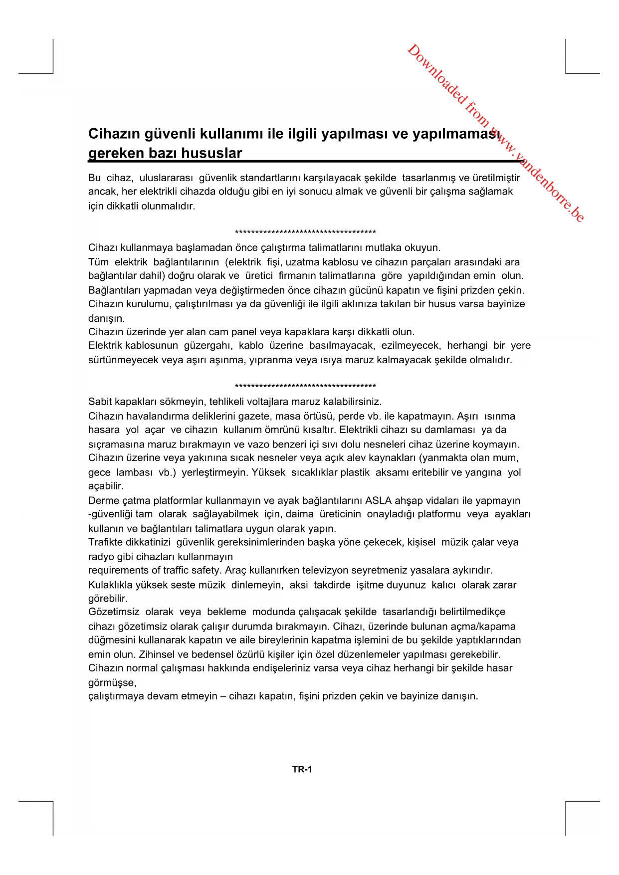 Sabit kapakları sökmeyin, tehlikeli voltajlara maruz kalabilirsiniz. Cihazın havalandırma deliklerini gazete, masa örtüsü, perde vb. ile kapatmayın. Aşırı ısınma hasara yol açar ve cihazın kullanım ömrünü kısaltır. Elektrikli cihazı su damlaması ya da sıçramasına maruz bırakmayın ve vazo benzeri içi sıvı dolu nesneleri cihaz üzerine koymayın. Cihazın üzerine veya yakınına sıcak nesneler veya açık alev kaynakları (yanmakta olan mum, gece lambası vb.) yerleştirmeyin. Yüksek sıcaklıklar plastik aksamı eritebilir ve yangına yol açabilir. Derme çatma platformlar kullanmayın ve ayak bağlantılarını ASLA ahşap vidaları ile yapmayın -güvenliği tam olarak sağlayabilmek için, daima üreticinin onayladığı platformu veya ayakları kullanın ve bağlantıları talimatlara uygun olarak yapın. Trakte dikkatinizi güvenlik gereksinimlerinden başka yöne çekecek, kişisel müzik çalar veya radyo gibi cihazları kullanmayın requirements of trafc safety. Araç kullanırken televizyon seyretmeniz yasalara aykırıdır. Kulaklıkla yüksek seste müzik dinlemeyin, aksi takdirde işitme duyunuz kalıcı olarak zarar görebilir. Gözetimsiz olarak veya bekleme modunda çalışacak şekilde tasarlandığı belirtilmedikçe cihazı gözetimsiz olarak çalışır durumda bırakmayın. Cihazı, üzerinde bulunan açma/kapama düğmesini kullanarak kapatın ve aile bireylerinin kapatma işlemini de bu şekilde yaptıklarından emin olun. Zihinsel ve bedensel özürlü kişiler için özel düzenlemeler yapılması gerekebilir. Cihazın normal çalışması hakkında endişeleriniz varsa veya cihaz herhangi bir şekilde hasar görmüşse, çalıştırmaya devam etmeyin – cihazı kapatın, şini prizden çekin ve bayinize danışın. Downloaded from www.vandenborre.beTR-2 HEPSİNDEN ÖNEMLİSİ, Hiç kimsenin, özellikle de çocukların, cihaz üzerinde yer alan deliklerden, yuvalardan veya diğer açıklıklardan içeriye bir şey sokmalarına izin vermeyin - ölümle sonuçlanan elektrik çarpmaları meydana gelebilir. ASLA elektrikli cihazlarla çalışırken işi tahmine veya şansa bırakmayın tedbirli olmak pişman olmaktan iyidir!